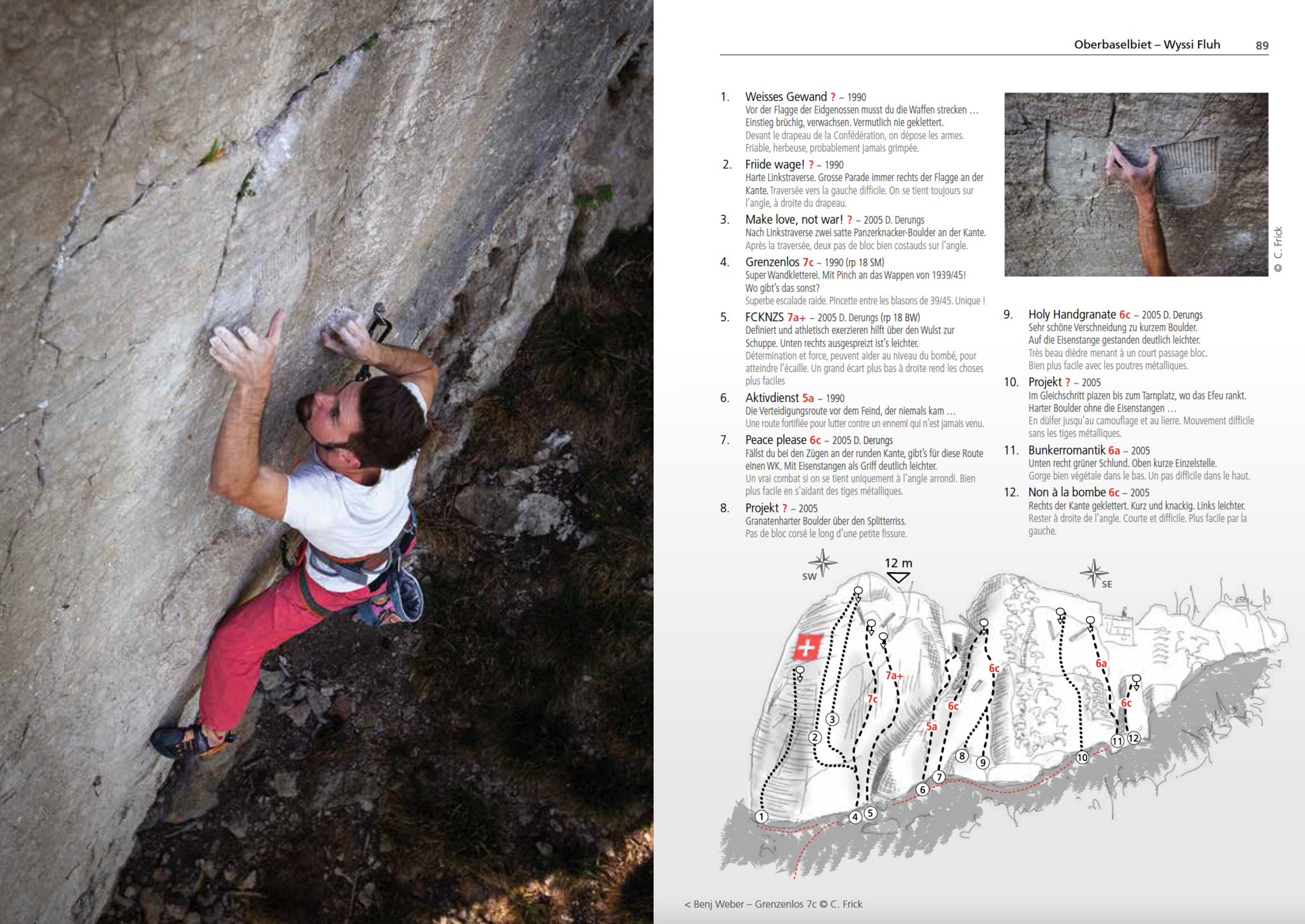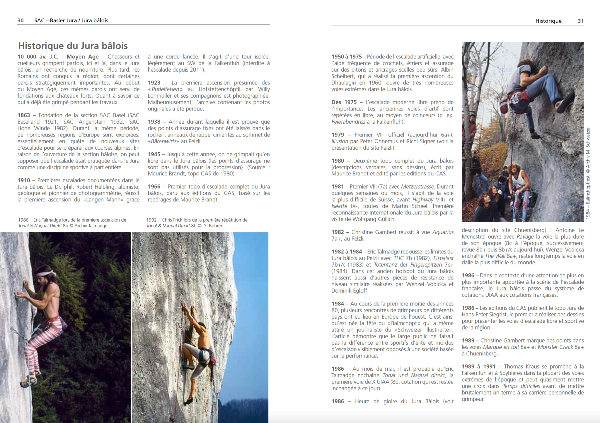 Le Jura bâlois constitue l’une des plus importantes et anciennes destinations d’escalade de Suisse. Le topo d’escalade « Jura bâlois » décrit de manière détaillée l’ensemble des falaises actuellement accessibles pour l’escalade. Des illustrations, des informations complémentaires et même une description de chaque voie permettent de retracer l’histoire de l’escalade dans le Jura bâlois. Qui se rappelle qu’autrefois le Jura bâlois était mondialement reconnu en raison de ses voies extrêmes ? Des informations sur la géologie et le milieu naturel viennent encore étoffer ce topo. Une grande partie du topo est basée sur le légendaire « Fluebible ».