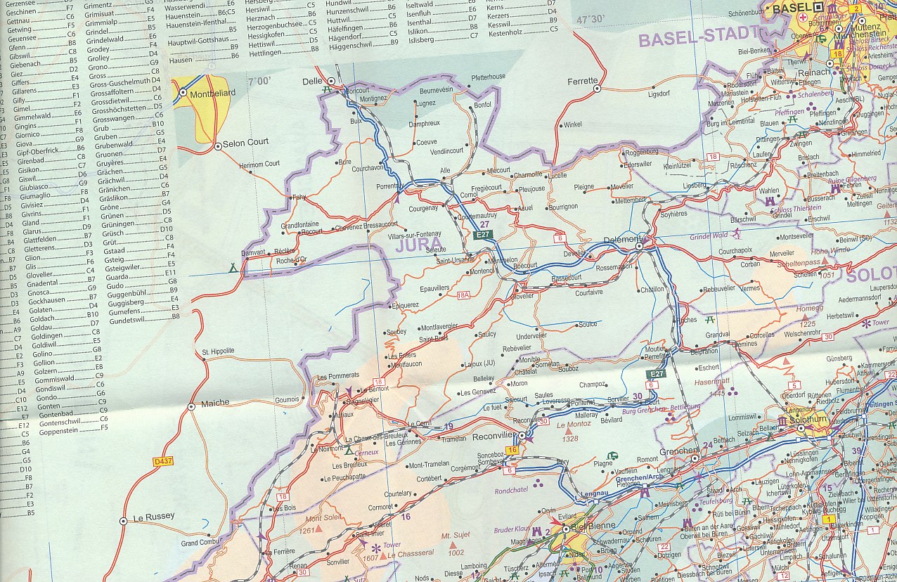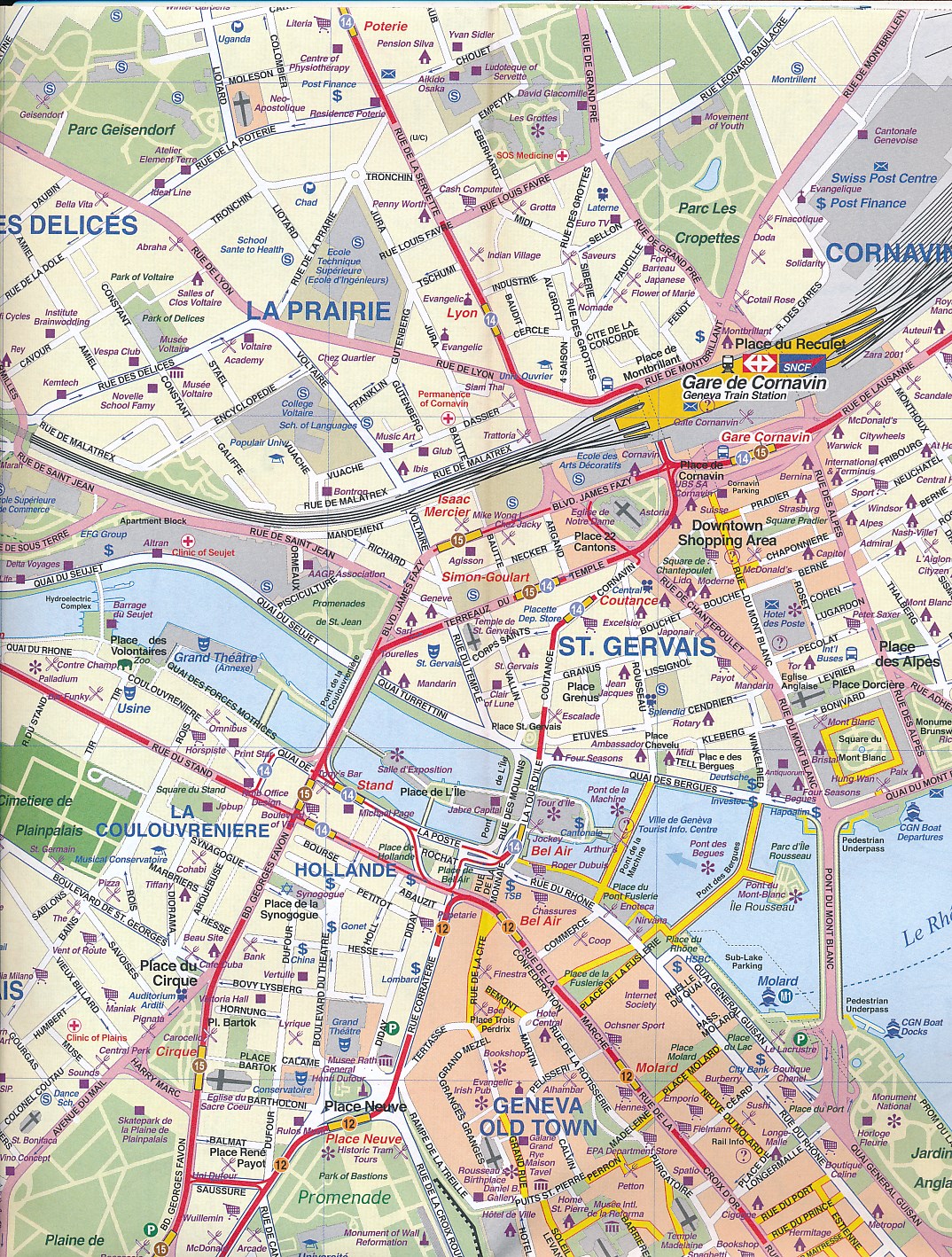 This map has been a long time in development preparation. The data for a sophisticated country like Switzerland needs delicate handling to do justice to this lovely country. We did not want to do 'just' another road map, similar to those available from a variety of European publishers. Our version shows the physical reality of this mountainous country to good advantage without obscuring the places of interest to visitors. The road/rail infrastructure within the country is well shown with perhaps more villages being included than would normally be the case. The road network in surrounding countries has been simplified to focus attention on Switzerland itself. Touristic points, such as castles, fortresses, ski areas, and museums have been included, but we removed a lot of data, such as gas stations, schools, post offices, most churches and police stations in an effort to avoiding cluttering the map with an over-load of information. The Geneva side of the map goes from the airport in the north to south of the Old Town and from the Lancy area in the west to the UN complex in the east, showing an improved range of major buildings and businesses as well as hotels, restaurants, pedestrian walkways, churches, tram and train lines and stations, and of course, the famous Jet D'Eaux.
