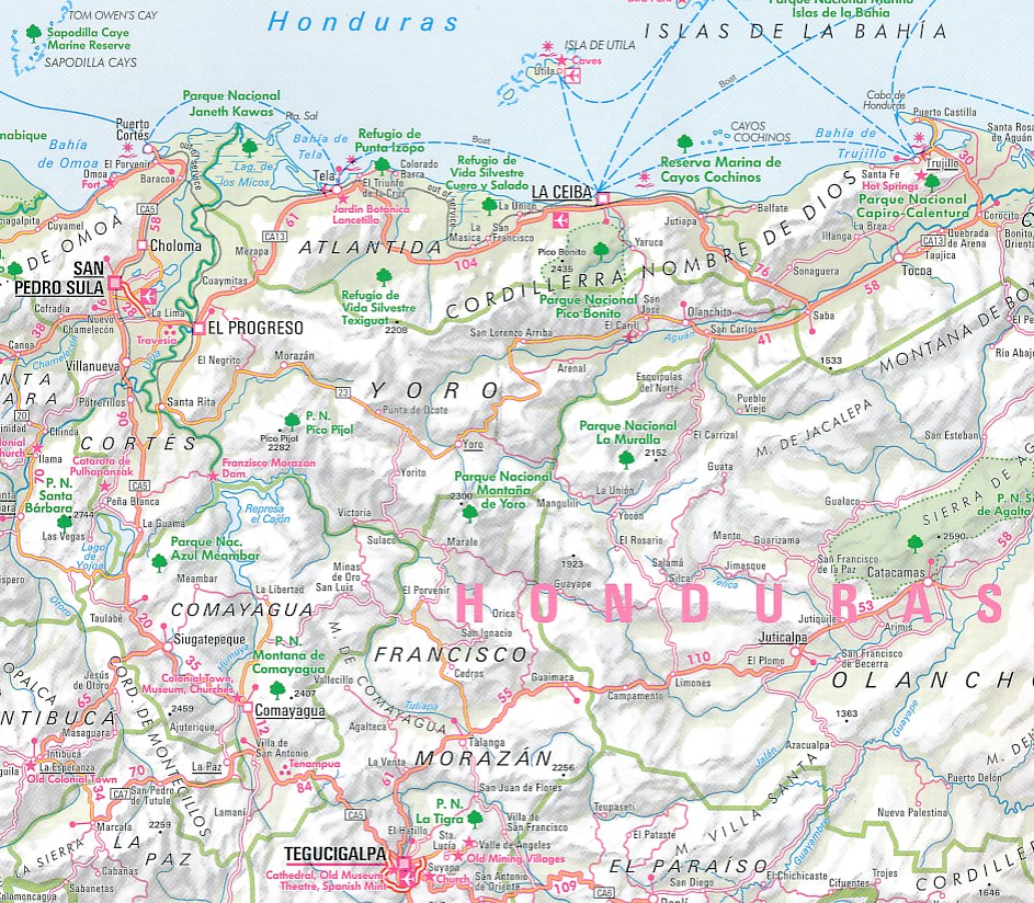 Goede overzichtskaart van Midden Amerika zonder Mexico. Aan beide kanten bedrukt. Met veel toeristische aanduidingen als nationale parken en culturele bezienswaardigheden. Prima leesbare kaart.