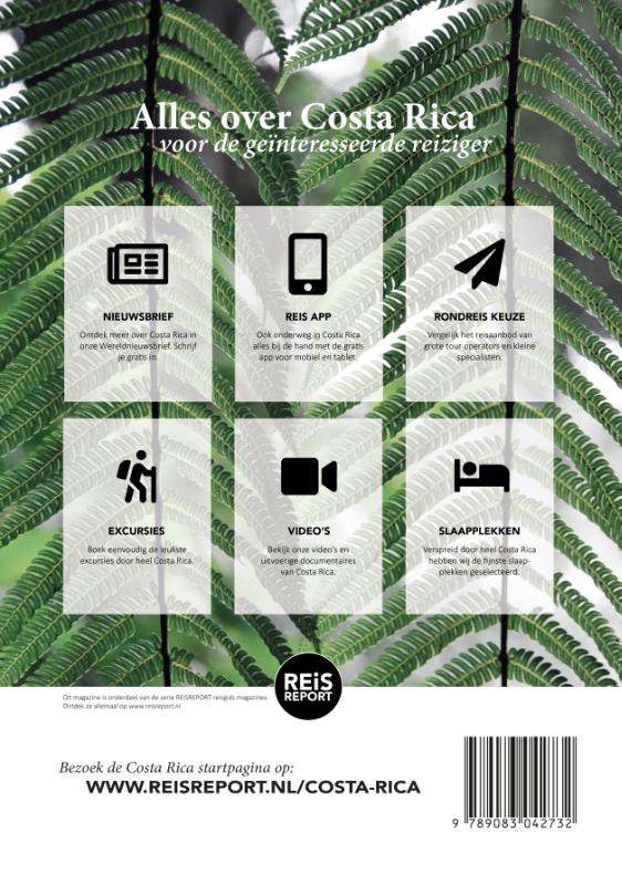 Het Costa Rica reisgids magazine is speciaal gemaakt voor de geïnteresseerde Costa Rica reiziger. De reiziger die meer wil weten over cultuur, natuur, geschiedenis en mensen en voor wie de reis al ver vóór vertrek begint met inhoudelijke voorbereidingen. Een luxe uitgave van het Nederlandse reisplatform REiSREPORT dat zowel los als in combinatie met de REiSREPORT app, een praktische en inhoudelijke voorbereiding op je reis biedt. Tientallen aanvullende Nederlandstalige video's zijn te vinden op www . reisreport . nl.
