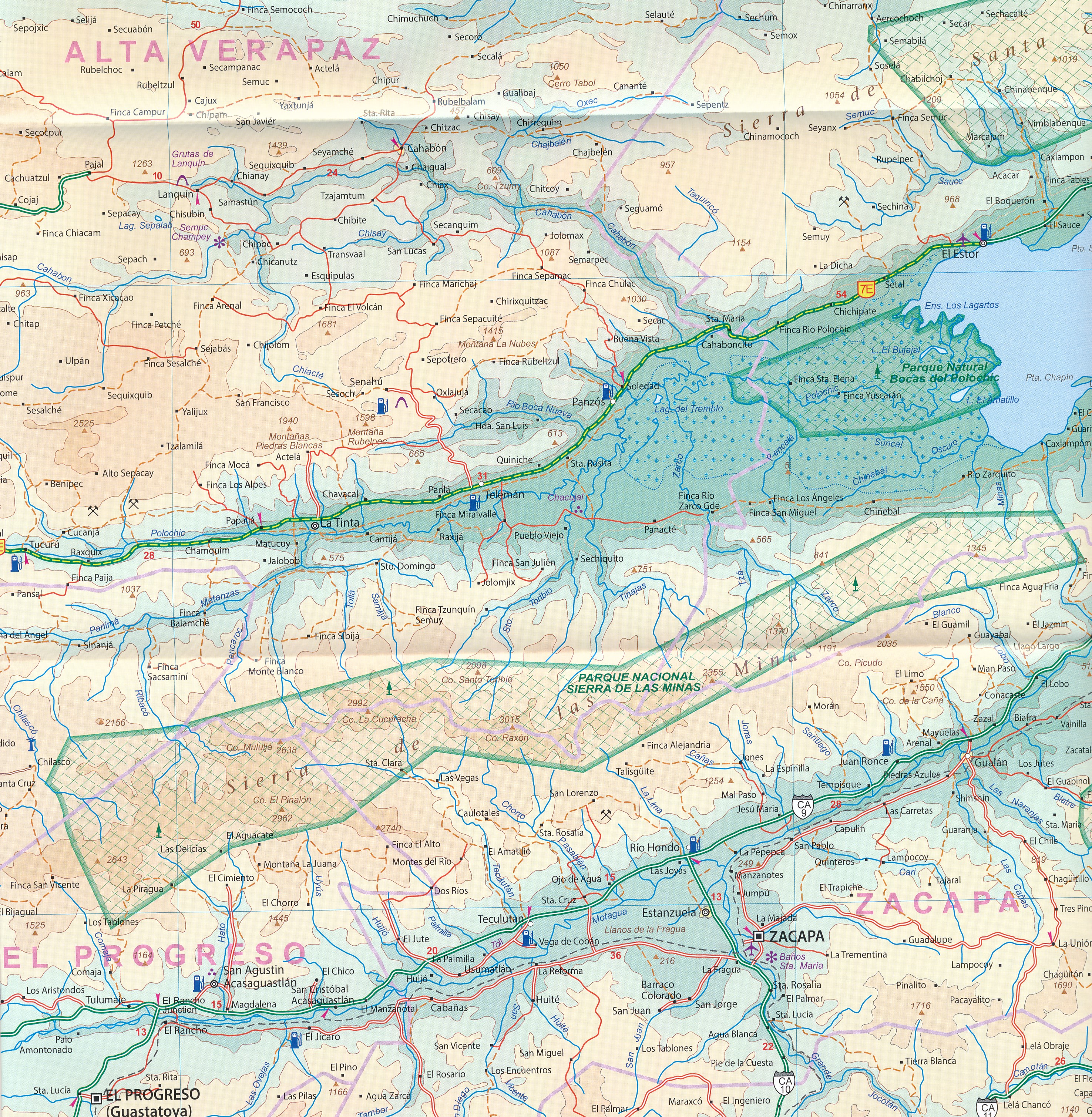This is a double-sided map with the El Salvador (1:270.000) on one side, along with a detailed inset map of San Salvador. The maps also shows the country's World Heritage city of Chalchuapa, dating back 3,200 years. The other side of the sheet is a completely separate maps of neighbouring Guatemala, being a detailed map of the central southern portion (1:457.000)of this important country. The highlights shown on this map are Quetzaltenango, Antigue Guatemala, and the Mayan ruins of Quirigua, dating from 200ad. The border crossings with El Salvador are clearly shown and are easily crossed.