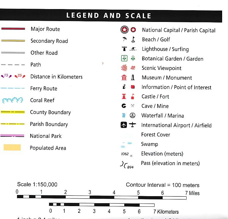 Wegenkaart van Jamaica met vermelding van veel bezienswaardigheden, nationale parken en attrakties. Watervast en scheurvast. Juist door deze vermeldingen onderscheidt de kaart zich van andere wegenkaarten.