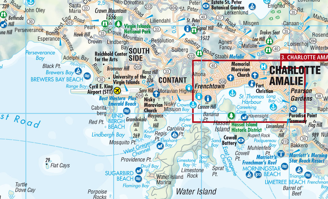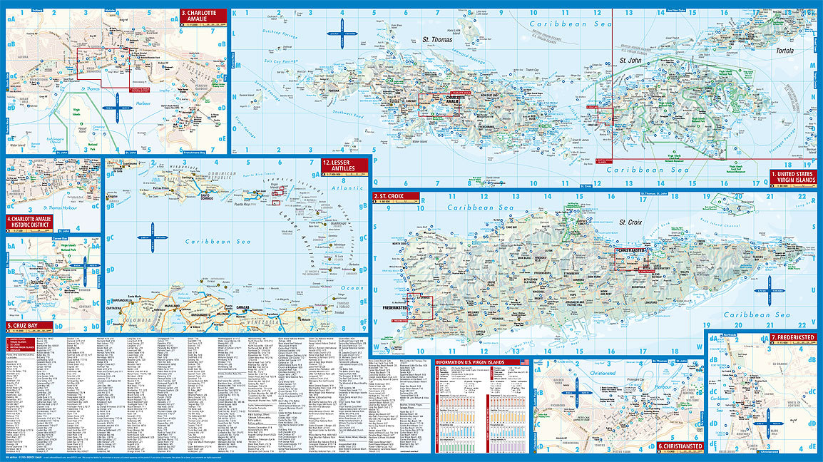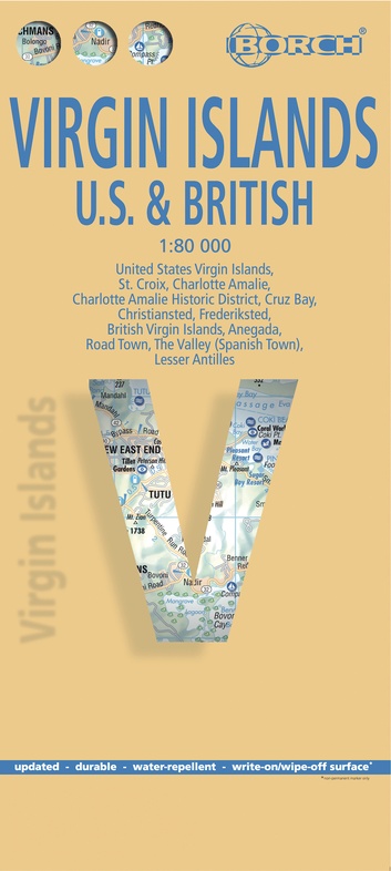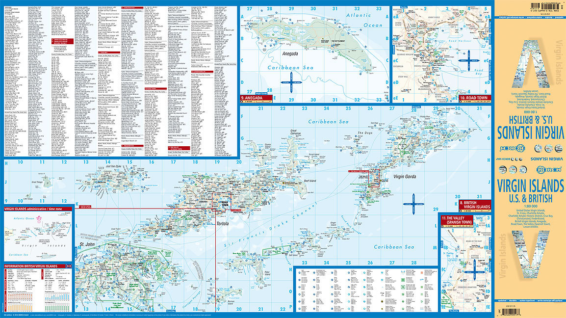 The soft-laminated map of the Virgin Islands includes: US Virgin Islands 1:80 000, St. Croix 1:80 000, Charlotte Amalie 1:15 000, Charlotte Amalie Historic District 1:7 500, Cruz Bay 1:15 000, Christiansted, Frederiksted 1:15 000, British Virgin Islands 1:80 000, Anegada 1:80 000, Road Town, The Valley (Spanish Town) 1:15 000, Lesser Antilles 1:7 000 000, Virgin Islands administrative / time zones; interesting statistics British / US Virgin Islands: conversion chart for temperatures, weights and measures; climate chart with temperatures, sunshine hours, precipitation and humidity; hotels, museums, markets and much more.