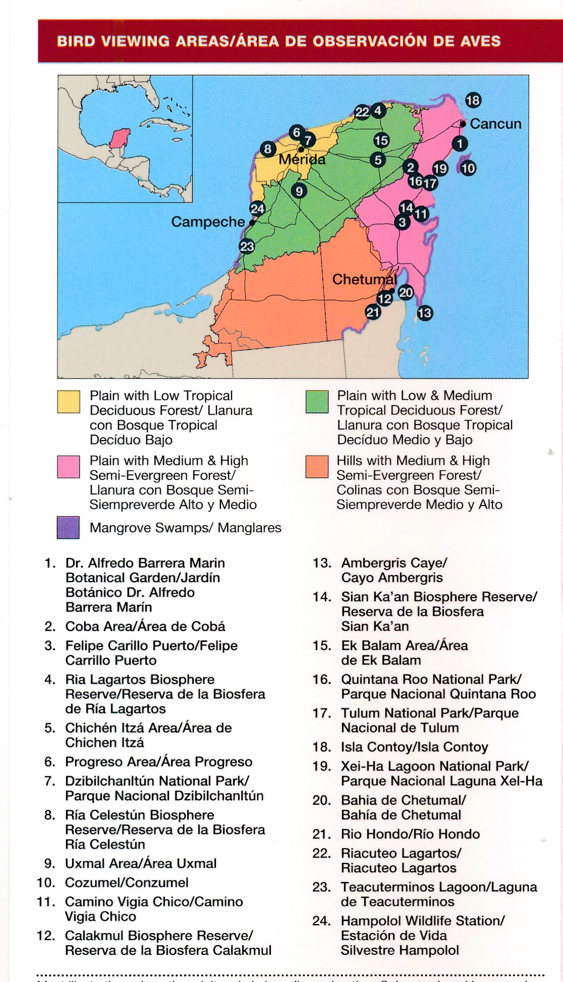 Een bijzonder handige uitklapkaart met alle veelvoorkomende vogels van Yucatan. Duidelijke illustraties, goede korte omschrijving van soort en leefgebied, geplastificeerd.