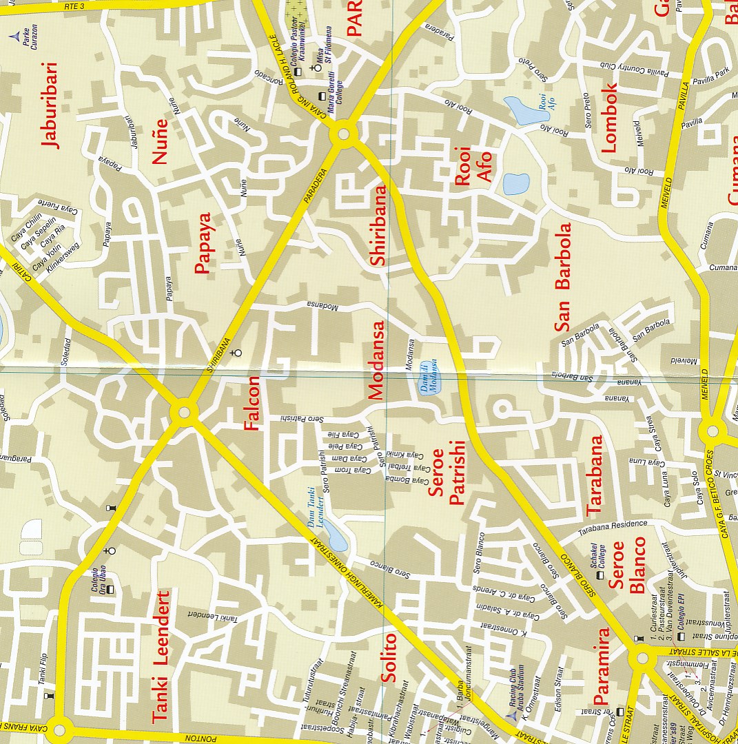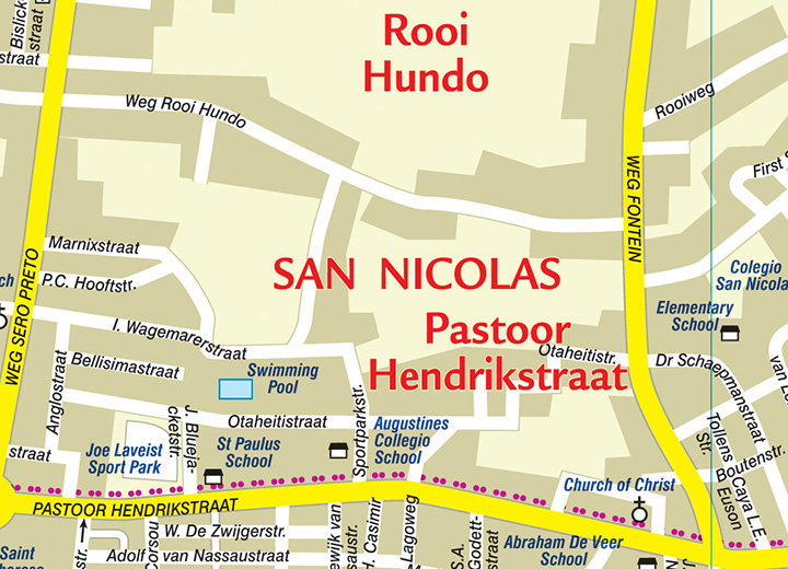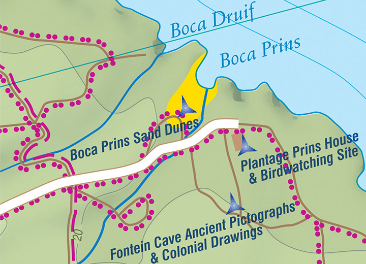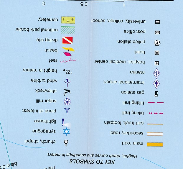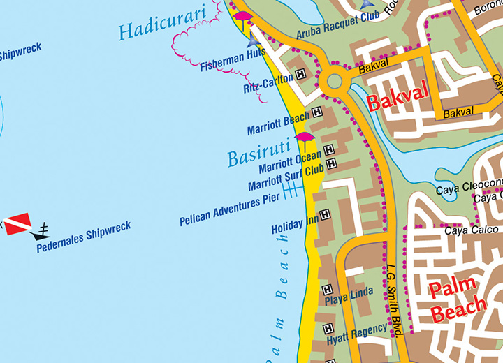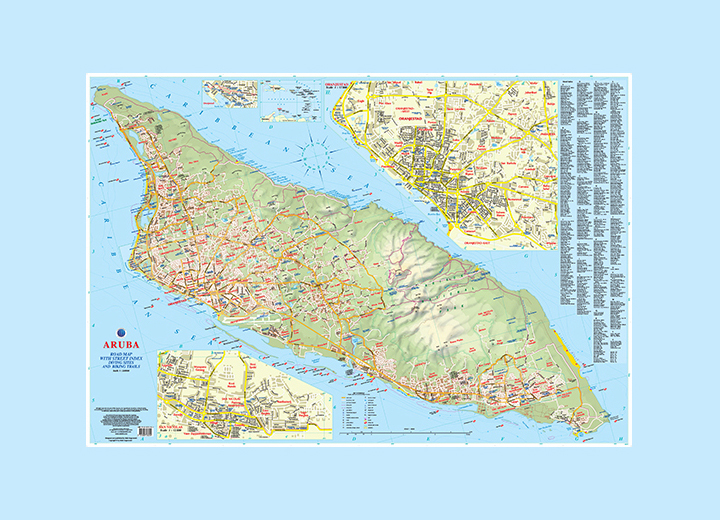 Bijzonder gedetailleerde kaart (1:28000) van alleen het eiland Aruba. Zowel de wegen als ook de wandelpaden staan er op vermeld. Stranden, interessante plekken en bovendien de meeste duikplakken staan met diepte helder weergegeven op de kaart. Met stadsplattegrond van Oranjestad.