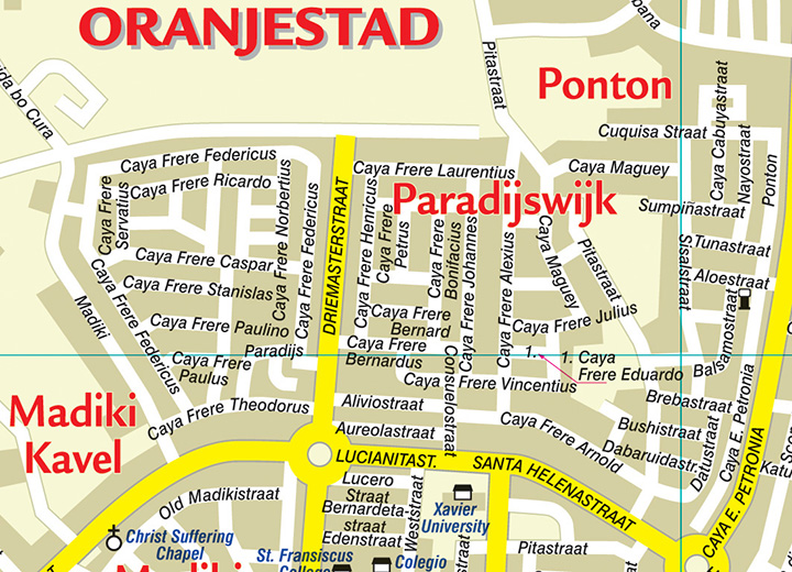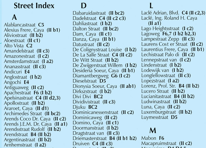 De kaart is verouderd. Ik schat een jaar of 10 oud. Een belangrijke doorgaande weg die als een verkeersader door Oranjestad loopt staat er niet op en de Ezelopvang is in 2015 naar een andere locatie gegaan dan op de kaart staat vandaar de inschatting van de ouderdom van de kaartgegevens. Overigens verandert er in de hoofdwegen verder niet zo heel veel dus de kaart was wel bruikbaar.
