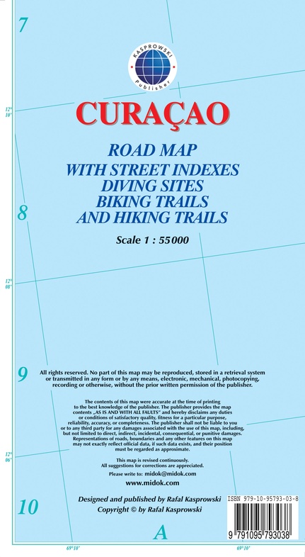 Bijzonder gedetailleerde kaart (1:55000) van alleen het eiland Curacao. Zowel de wegen als ook de wandelpaden staan er op vermeld. Stranden, interessante plekken en bovendien de meeste duikplakken staan met diepte helder weergegeven op de kaart. Met stadsplattegrond van Willemstad.