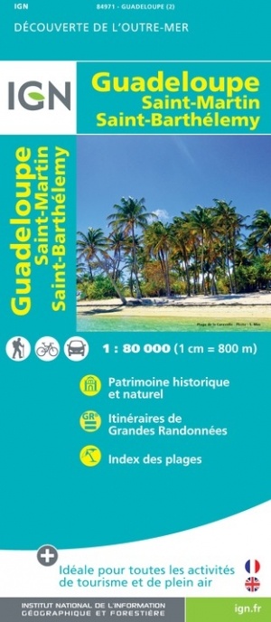 Landkaart van deze voormalige Franse kolonie. Vanzelfsprekend gemaakt door de Franse topografische dienst. Gedetailleerde topografische wegenkaart Guadeloupe, Sint Maarten en St Barts schaal 1:80.000 met opdruk van bezienswaardigheden, stranden en wandelpaden en stadsplattegronden van Basse-Terre en Pointe a Pitre