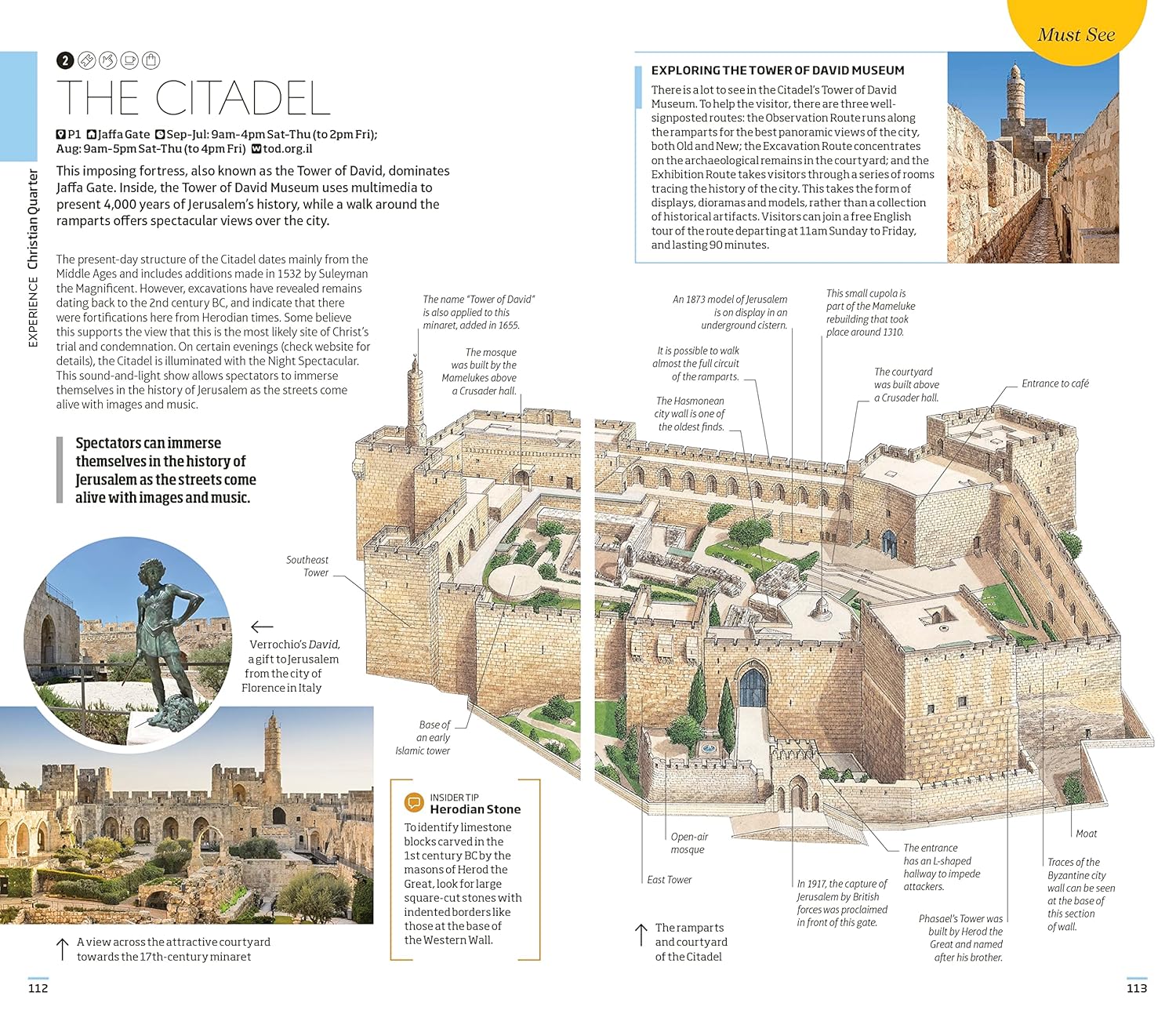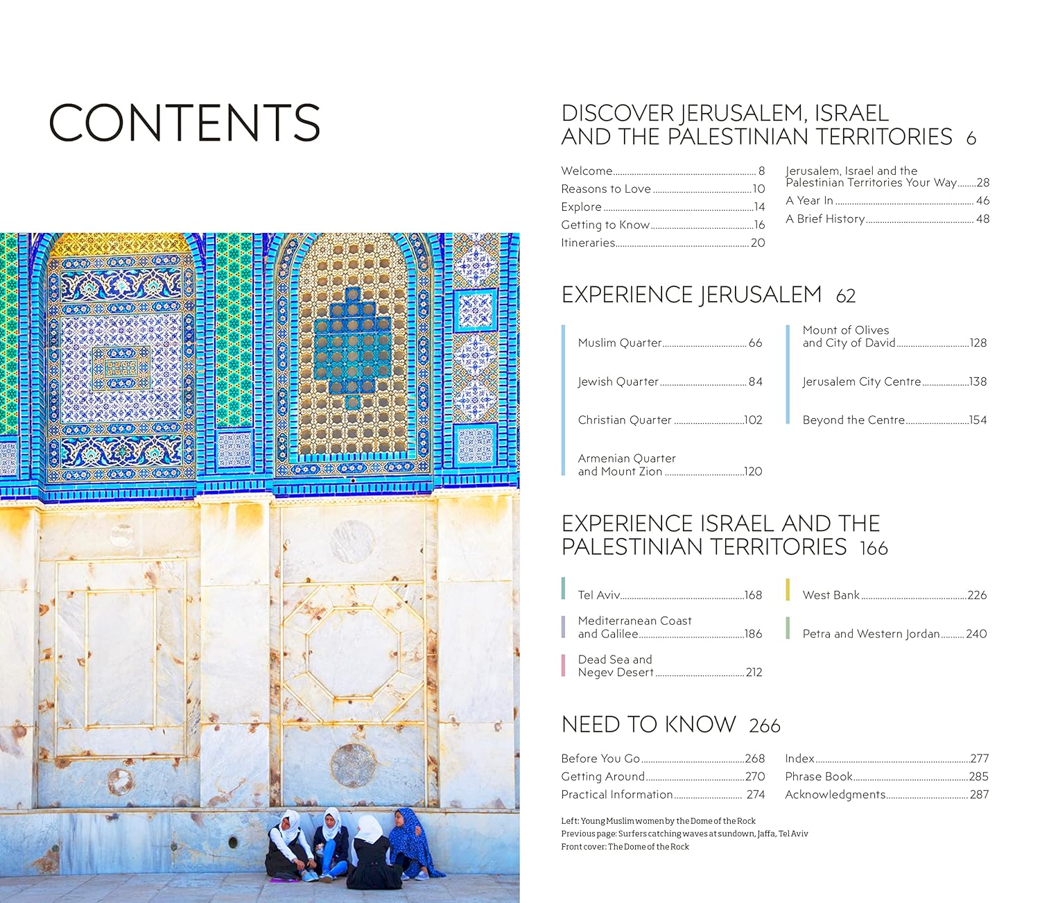 -Covers: Muslim Quarter, Jewish Quarter, Christian Quarter, Armenian Quarter and Mount Zion Mount of Olives and City of David, Jerusalem City Centre, Tel Aviv, Mediterranean Coast and Galilee Dead Sea and Negev Desert West Bank, Petra and Western Jordan.
