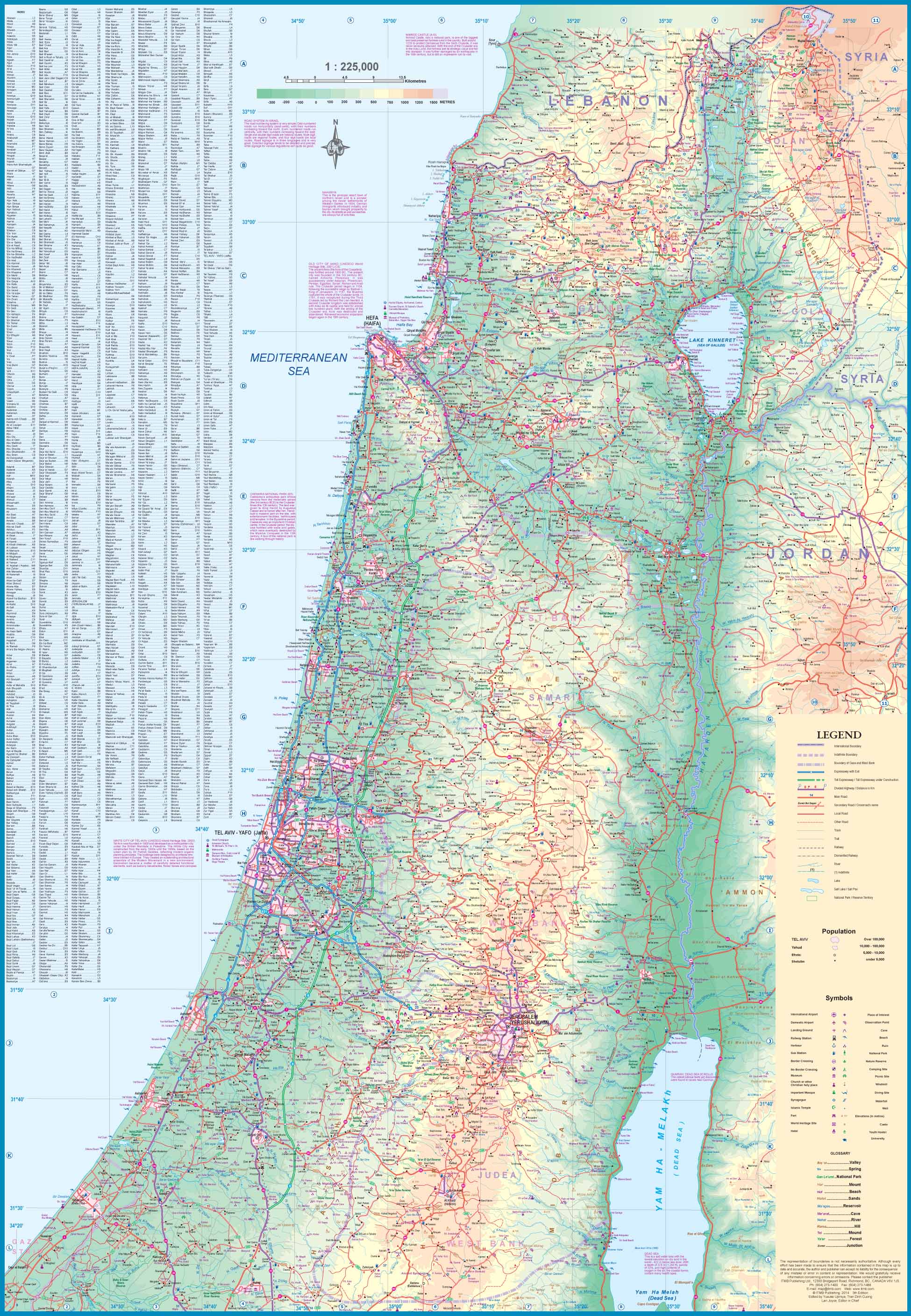 Een goede kaart van Jeruzalem en op de andere zijde noord- Israel met een schaal van 1:225.000, gedrukt op scheur- en watervast papier. Let op: de index van de kaart bevat plaatsnamen van geheel Israël en bevat zodoende plaatsnamen die niet op deze kaart staan.