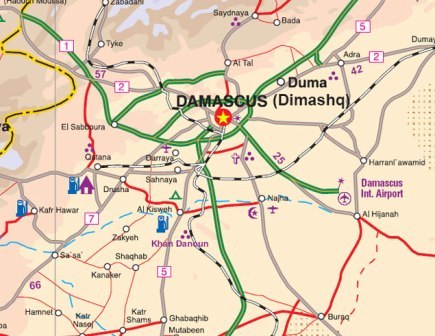 Wegenkaart Jordanië en SyriëJordan with a street plan of Amman, plus Syria with a street plan of Damascus on a double-sided map with each road map indexed and presenting the topography by altitude colouring.