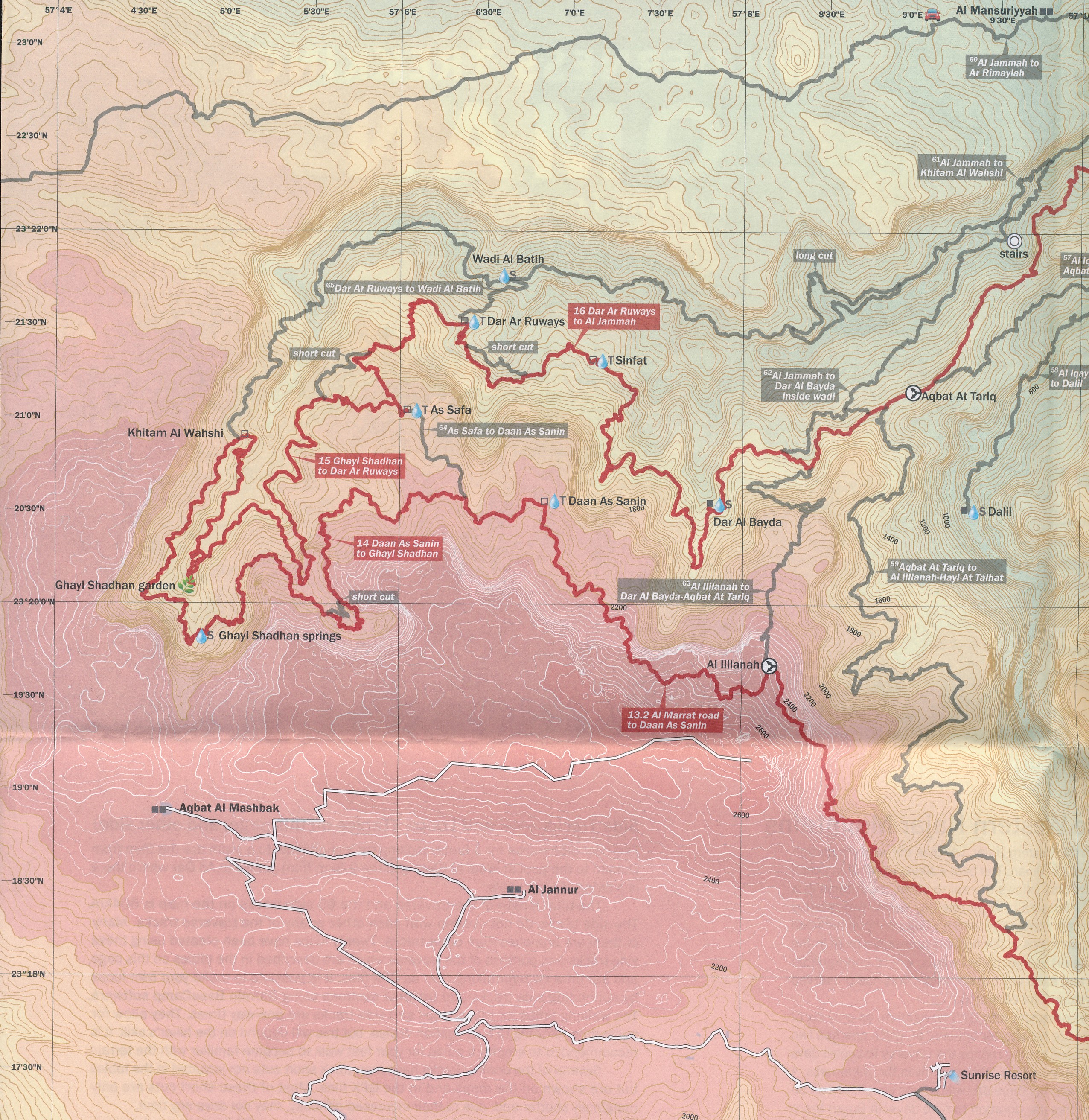 It consists of eight one-day walks, two two-day walks and one four-day walk. There is a road intersection with a village or hotel between each of these eleven sections making it practical to walk sections rather than the full traverse. The track climbs to the highest accessible peak in the country at 2999m and finishes in remote dry valleys, called wadis, where impregnable cliffs have precluded road construction and electricity transmission.