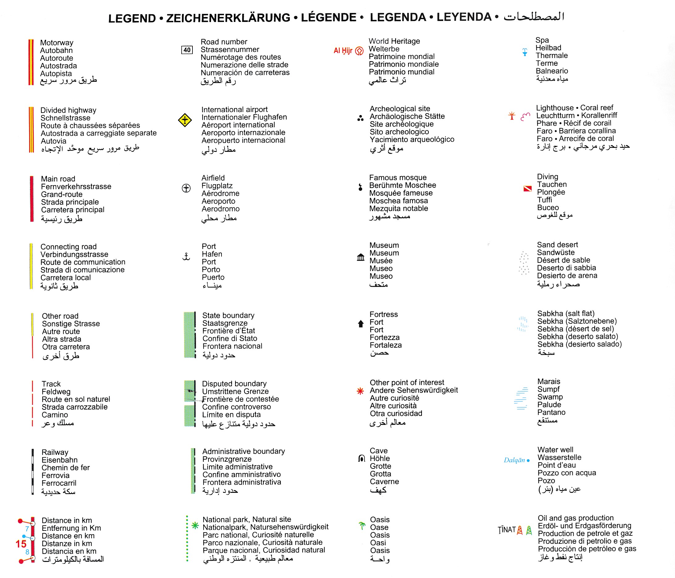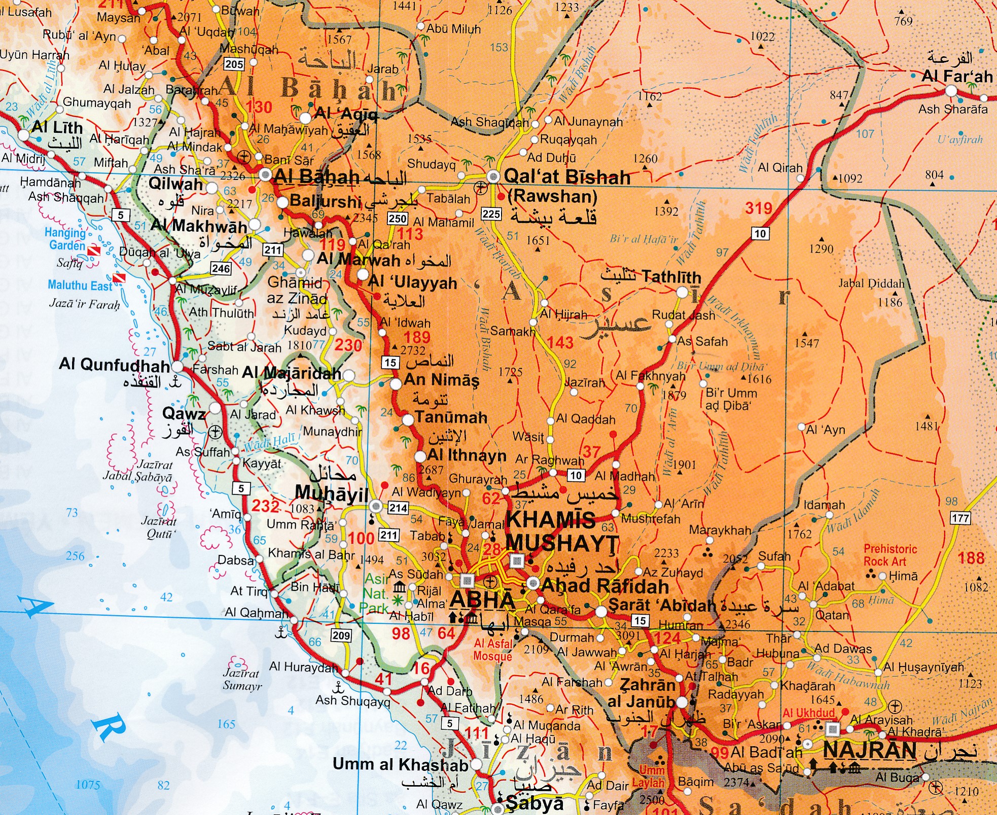 Natuurkundige wegenkaart van Saudi Arabië met ook veel aandacht voor het wegennet en plaatsen, achterop de kaart staat een uitgebreid register.