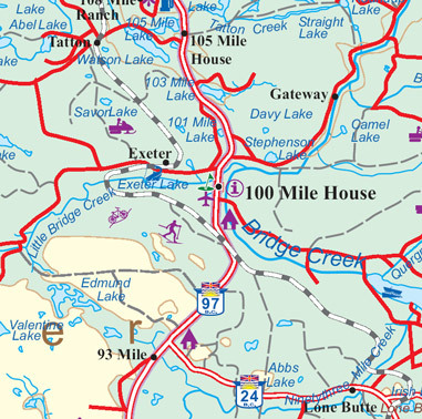 Roads by classification, Indian reserves, rivers, lakes, beaches, hot springs, gas stations, wildlife viewing, mines, glaciers, dams, falls, points of interests, camping and recreational sites, wilderness camps, picnic areas, fishing areas, parking, canoeing, hiking, tourist information and more.