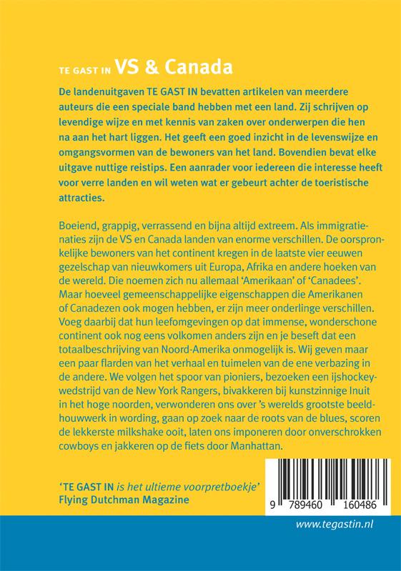 Het is een illusie om in een pocketuitgave van 96 pagina's een compleet beeld te geven van de Amerikaanse en de Canadese samenlevingen. De landen zijn zo immens groot, de bevolkingsgroepen zo uiteenlopend en hun leefomstandigheden zo gevarieerd, dat zelfs een Bijbeldik boek niet volledig zou kunnen zijn. Maar dat hoeft ook niet. TE GAST IN VS & Canada laat aan de hand van een aantal thema's zien dat Amerika en Canada weliswaar landen zijn waarvan we al veel weten, maar die ons ook telkens weer verrassen. Wat je tegenkomt op je reizen is boeiend, grappig, ontroerend, adembenemend en heel vaak extreem. Wie de moeite neemt vooroordelen opzij te zetten en de landen en hun bewoners met een open mind wil benaderen, zal dat moeten beamen. Deze uitgave helpt daarbij.
