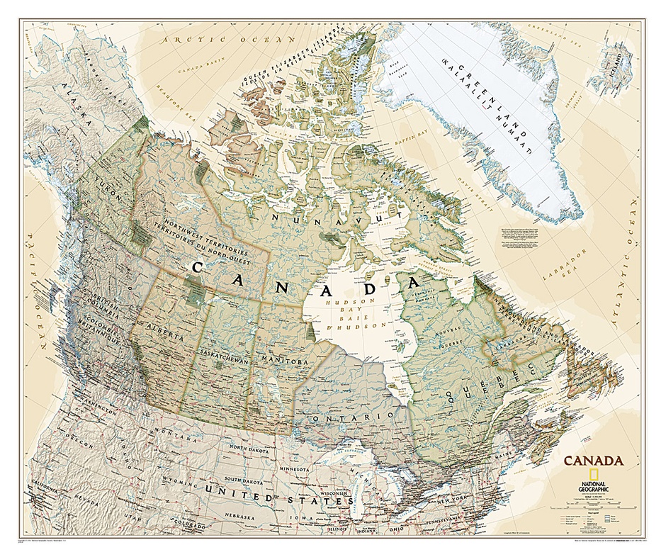 Our most detailed wall map of Canada, features the classic National Geographic reference styling. Features thousands of place names, accurate political boundaries, national parks, archeological sites, and major infrastructure networks such as roads, canals, ferry routes, and railroads. Canada’s diverse terrain is detailed through accurate shaded relief, coastal bathymetry, and symbolism for water features and other landforms. This wall map depicts Canada and the areas surrounding the Great Lakes. Includes Canadian provinces and US State boundaries.