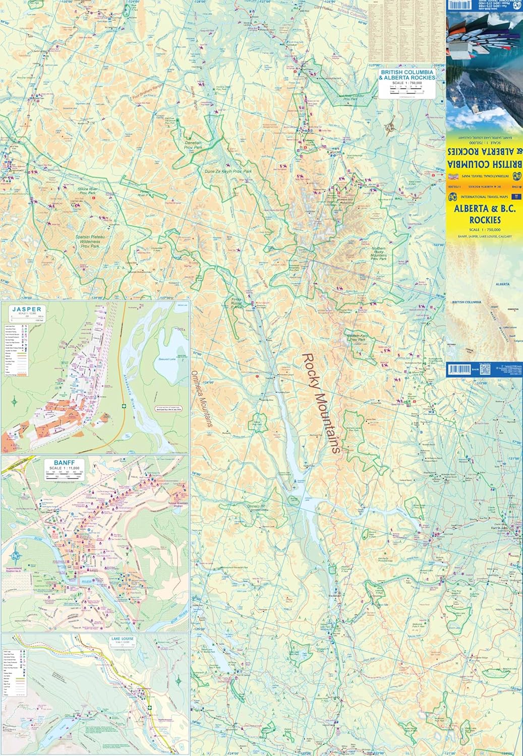 The Rocky Mountain chain forms the boundary between the Canadian provinces of Alberta and British Columbia. There are only three passes through the mountain chain, which somewhat isolates BC from the rest of Canada (a mixed blessing). The Rockies are also the paramount travel attraction of Canada, nice though our many lakes, waterfalls, and cities happen to be. This double-sided map covers the three national parks of Banff, Jasper, and Yoho, and several provincial parks on both sides of the border, which also forms the continental divide between rivers flowing to the Pacific or to the Atlantic, covering from Calgary to the northern portion of the Fraser Canyon on one side, and the more northerly stretch of the Rockies from Fort St. John to the Yukon. Good inset maps of Calgary, Banff, Jasper, and Lake Louise are included. The focus of this map is its many recreational opportunities, with an emphasis on campgrounds, ski areas, historic sites, and secondary roads. The area of coverage is vast; the size of Western Europe, and straddles two time zones.