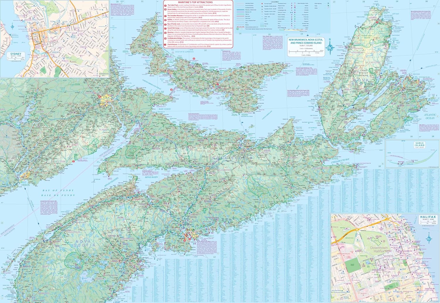 Wegenkaart Maritieme Provincies CanadaThe Atlantic coast of Canada is blessed with some of the earliest European settlement areas in North America. There are three Canadian provinces that have been traditionally called ‘maritime’ - New Brunswick, Nova Scotia, and Prince Edward Island. Newfoundland only became part of Canada in 1949, a century after the term Maritimes had become common usage, so is part of Atlantic Canada, but not the Maritime provinces. This double-sided regional map is great for those visiting all three provinces (ITMB also publishes separate maps of each province). All the roads and towns are shown, as well as parks, camping areas, touristic attractions, and historic sites. The area is rich in history. Last summer, Lan and I took our two grandchildren on a month-long drive across Canada and visited Louisbourg, on Cape Breton, the French fortress that dominated French control of Quebec for many years. We also toured Green Gables, the actual farm made famous by L. M. Montgomery and her fictional Anne Shirley. Roosevelt’s beloved estate is on Campobello Island, in New Brunswick. This is one of the most popular regions of North America to visit.