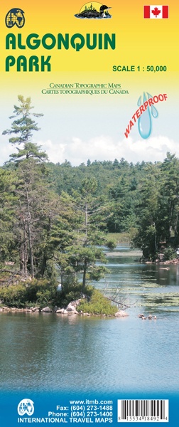 Algonquin is an enormous tract of land in central Ontario, Canada, that was set aside as a wilderness preserve generations ago. About the size of Belgium, this preserve of lakes scattered across the Great Canadian Shield consists of dozens of canoe routes, hiking trails, and camping sites in a protected environment that is a national treasure. Our map shows the park and its attractions on one side, and the southern portion (the most used) on the other side. This map is ideal for planning a canoe trip, and canoes can be rented in the park itself. Europeans, as well as Americans, flock to Algonquin, as it is the destination of choice for anyone wanting to 'get away from it all'. Printed on ITM plastic paper, double-sided.