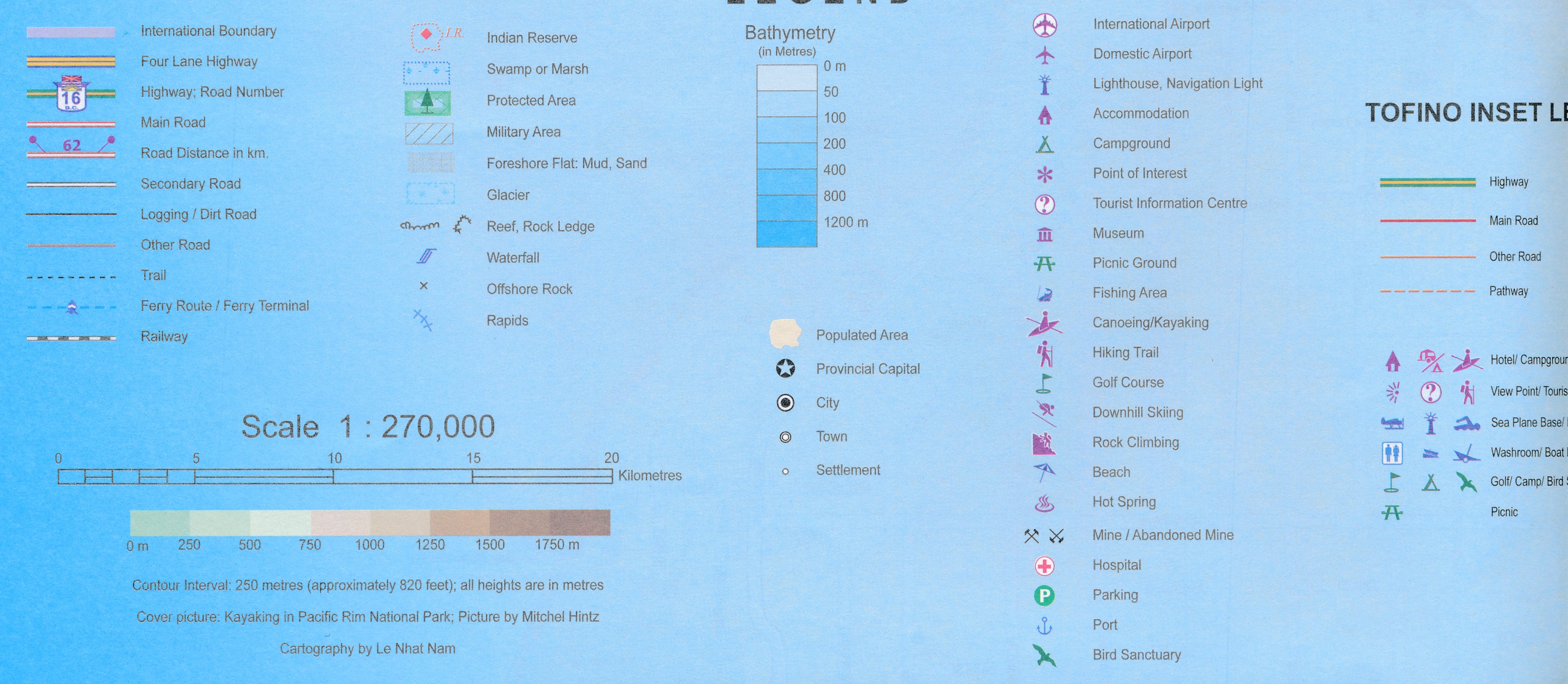 Victoria is a brand new title for ITMB. The city is the capital of British Columbia (each of Canada’s provinces and territories has its own capital, in addition to Ottawa for the entire country). Located at the southern tip of Vancouver Island, Victoria was established as the colonial capital after the Oregon Treaty of 1846 forced the British to abandon the previous capital, at Astoria, in what is now Oregon State. By western North American standards, Victoria has a long and colourful history, being settled at about the same time as San Francisco, Los Angeles, and Sacramento. After 1846, British Columbia remained a separate colony of Britain until 1971, when it agreed to join the now-established new country of Canada, based on the promise of a trans-continental railway being built to join the five provincial members. As a result, Victoria boomed, and its current charm as a touristic attraction is based largely on the growth in Victorian days. The cover picture shores the historic Empress Hotel, which is as well-known for its afternoon tea as for its dominating position on the harbour front. The provincial legislature building is close by, and is a real treat to visit, as is the nearby Royal BC Museum. Victoria is one of the great travel experiences of Canada, with daily ferries from the USA docking mere feet away from the Empress, float planes landing in the harbour hourly, and colonial architecture dominating the shopping streets. The reverse side of the sheet follows the pattern of many ITMB maps. It is a detailed map of the southern half of Vancouver Island, ideal for day trips from Victoria. It includes beautiful Butchart Gardens, a botanical wonderland, an inset of Tofino’s wonderful nine-mile beach, Cathedral Grove (which is the world’s largest gathering of old-growth fir trees), Chemanus (with its painted buildings), Duncan (with its logging museum), and Nanaimo. The famous West Coast Trail is shown, as are the Broken Islands. Finally the ferry routes to Vancouver and to the Gulf Islands are shown. This is a marvelous map of a well-known tourist destination.