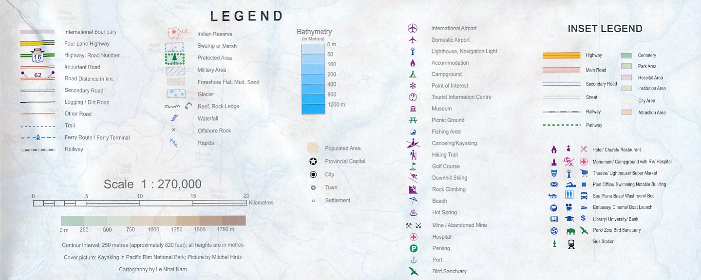 Folded road and travel map, in color. Scale 1:270,000. Distinguishes roads ranging from four lane highways to logging/dirt roads. Legend includes trails, ferry routes/terminals, railways, international/domestic airports, lighthouses, protected areas, military areas, glaciers, reefs/rock ledges, falls, rapids, campgrounds, points of interest, tourist information centres, museums, picnic grounds, fishing areas, canoeing/kayaking, hiking trails, golf courses, downhill skiing areas, rock climbing, beaches, hot springs, viewpoints, mines/abandoned mines. Includes inset map of Victoria. Indexed.