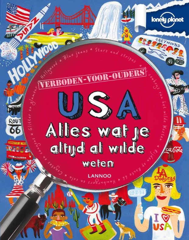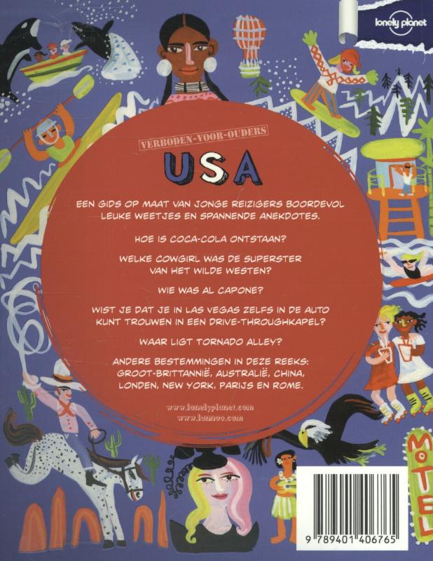 Na enkele kleurrijke stadsgidsen in de reeks 'Verboden-voor-ouders'* zijn er nu ook enkele landengidsjes. Dit handzame boek staat boordevol leuke fascinerende verhalen en weetjes over de Verenigde Staten. Verdeeld over ruim veertig hoofdstukjes zijn er boeiende en grappige anekdotes over het ontstaan van Coca-Cola, de goudkoorts, de magie van Disney, het houden van kakkerlakkenraces, de roemrijke hamburgers en nog veel meer Amerikaanse zaken. Elk thema wordt behandeld op twee naast elkaar liggende pagina’s, telkens eindigend met een verwijzing naar een Nederlandstalige of Engelstalige website. Speelse lay-out, maar vrij druk door de vele kleine kleurenfoto’s, tekstballonnetjes, getekende kleurenillustraties en cartoons. De binnenmarge is krap. De informatie staat in verschillende, ook kleine, lettertypes in tekstblokjes. Soms is die tekst vrij moeilijk voor de doelgroep. In de inhoudsopgave staan soms wat nietszeggende, maar wel intrigerende titels als 'Ruimte zat' en 'Supersurfer'. Achterin is een uitgebreid trefwoordenregister opgenomen. In de uitgave ‘Encyclopedie van alle landen’(2012)** is in dezelfde vormgeving, maar wat beknopter, ook aandacht besteed aan de Verenigde Staten. Aantrekkelijk boekje voor kinderen vanaf ca. 11 jaar