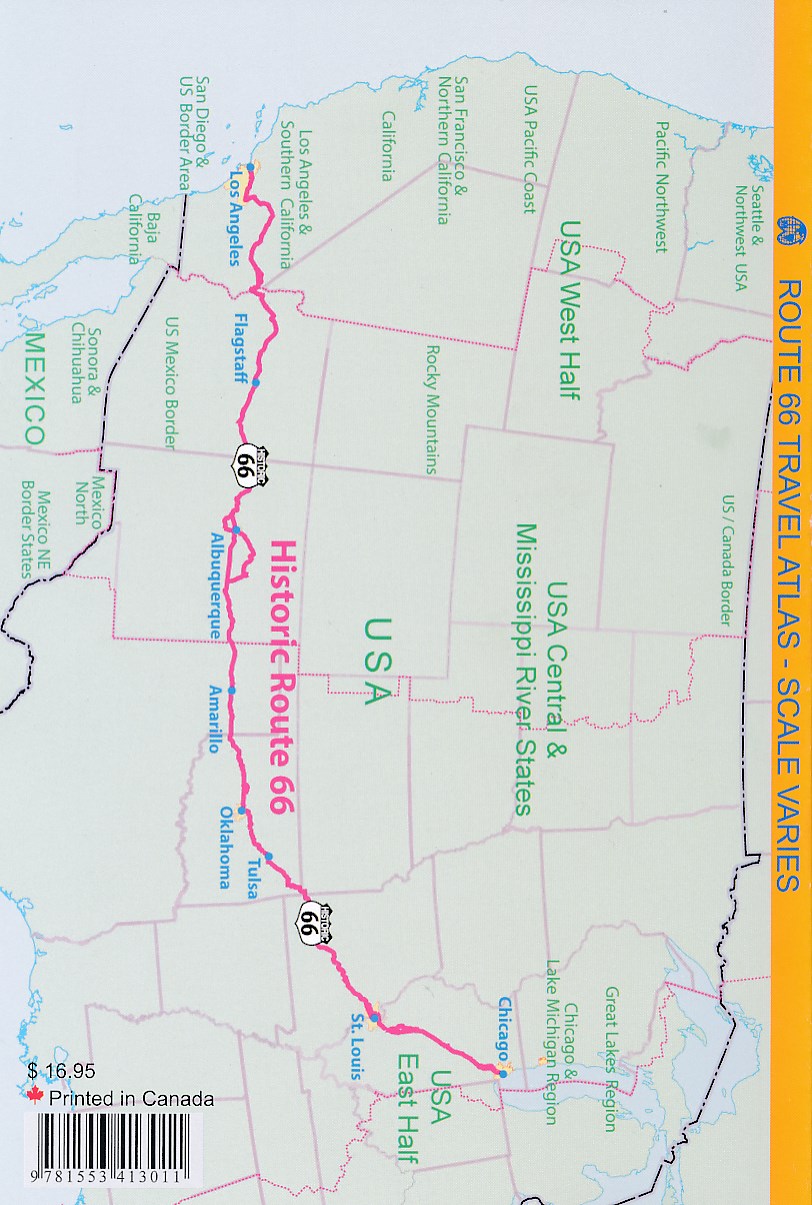 This atlas shows the route from its origins in Chicago, through Illinois and other States to California and its terminus in Santa Monica. Not only is the route followed and filled in with capsule comments about attractions en route, it includes all parks, historic sites, and attractions within reasonable driving distances from Route 66. This is the only highway in the world to have its own atlas. It is beautifully arranged and very detailed. It covers the entire 2,400 miles of the Route and includes many detailed city plans of urban areas along the highway. As a bonus, the Las Vegas and San Diego urban areas are included; 65 pages, printed on paper, saddle stitched.