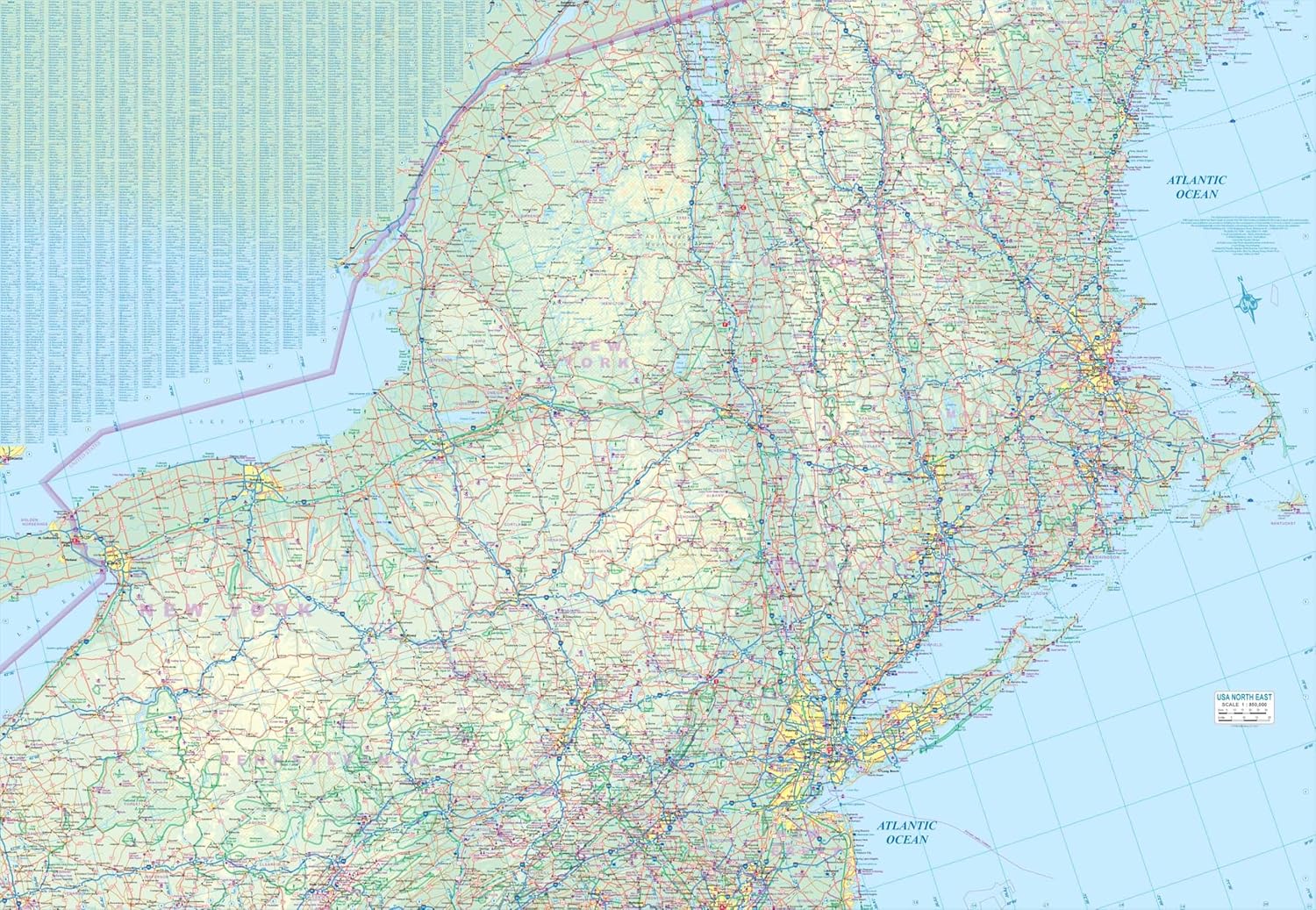 Wegenkaart USA NoordoostThis map is including adjacent US states and bordering Canada. By the shape of the USA, the New England States fill most of one side of the map, but New York City and Philadelphia are included as well as goodly portion of New York State. The second side covers the rest of the state, plus all of New Jersey, Delaware, Maryland, Pennsylvania, and most of Ohio, West Virginia and the northern portion of Virginia. In terms of cities, Cincinnati is at the bottom left of the sheet and Richmond at the bottom right, with Detroit at upper left and Albany at upper right, covers a reasonably comprehensive portion of the USA, stretching as it does from northern Maine to south of Washington, DC.