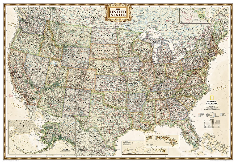 National Geographic's Executive reference map of the United States features all 50 States with insets for Alaska and Hawaii in antique-executive cartographic style. Each state is colored to clearly define borders and shaded relief accentuates geographical features. All major cities, transportation routes, state boundaries, National Parks, lakes and rivers, and mountain ranges are clearly displayed and labeled.