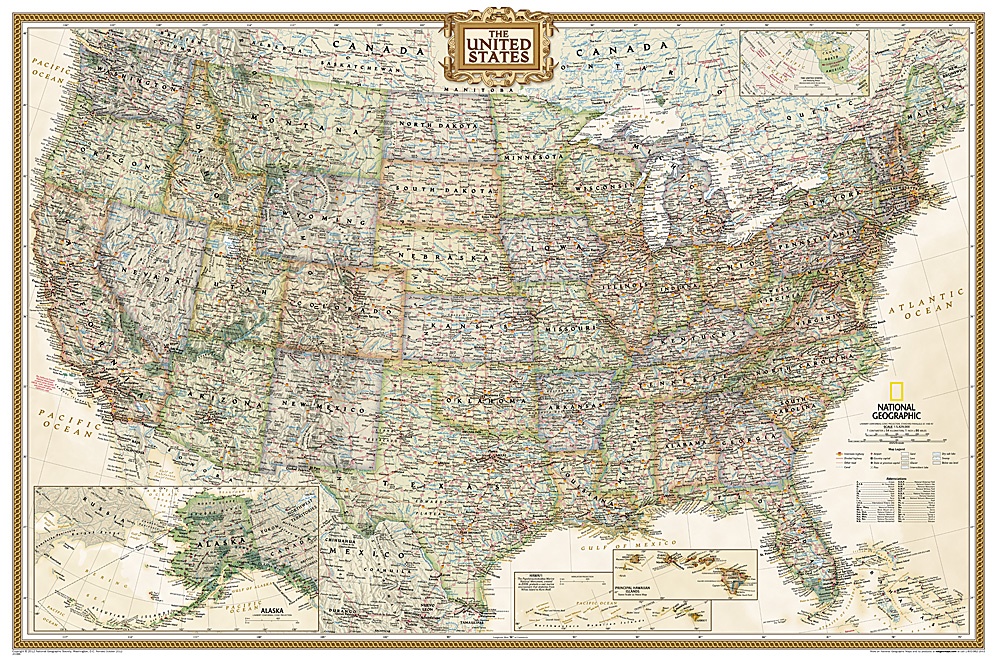 National Geographic's Executive reference map of the United States features all 50 States with insets for Alaska and Hawaii in antique-executive cartographic style. Each state is colored to clearly define borders and shaded relief accentuates geographical features. All major cities, transportation routes, state boundaries, National Parks, lakes and rivers, and mountain ranges are clearly displayed and labeled.