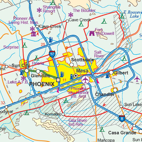 San Diego is one of the loveliest cities in America, situated just north of the Mexican border on a large harbour that makes it the principal military marine base on the Pacific Coast. The zoo in Balboa Park is justly famous, and the Old Town preservation preserve is wonderful to see. Downtown has been revitalized by many new developments, and anyone who hasn't taken the trolley to Tijuana has missed out on a wonderful experience (just remember to take your passport to get back into the USA). SD has also taken transit to heart as a way of easing unban congestion, so park your gas-guzzler and relax. As an added feature, we have developed a brand new map of the US/Mexican border areas, showing both sides for about a hundred miles on either side of the long border, as far as El Paso. All border crossings are shown, as well as attractions on either side of the border. Baja is shown as far south as Guerrero Negro, and 'mainland' Mexico as far south as Ciudad Obregon and Chihuahua. US centres include Las Vegas, Phoenix, Tucson, and the I-10 to east of El Paso. Borders are important, somewhat controversial realities. As is the case with the US/Canadian border, this one is militarily undefended, but strictly patrolled by enforcement agencies trying to control cross-border activity. Our purpose in showing the cross-border attractions in detail is to encourage peaceful and beneficial cultural enrichment. The current instability in Mexico seems to be coming to an end, so this map is a gesture of good faith in the future of two great countries.