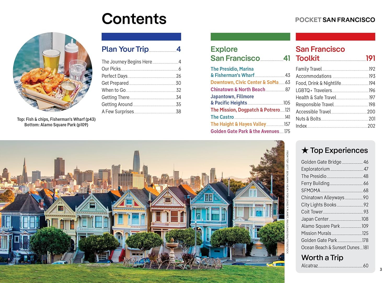 - Covers: The Presidio, Marina & Fisherman's Wharf; Downtown, Civic Center & SoMa; Chinatown & North Beach; Japantown, Fillmore & Pacific Heights; The Mission, Dogpatch & Potrero; The Castro; The Haight & Hayes Valley; Golden Gate Park & the Avenues plus a day trip to Alcatraz