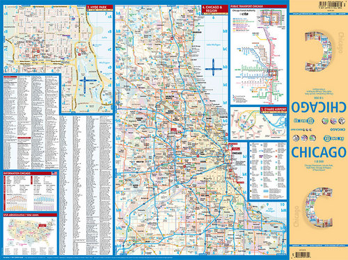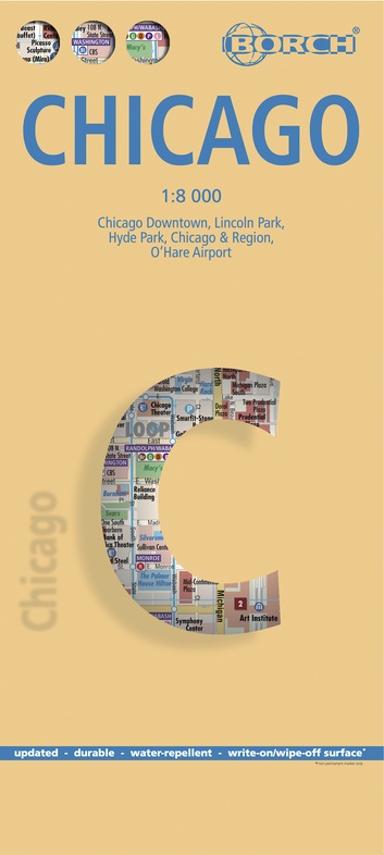 Our soft-laminated folded map of Chicago shows: Chicago Downtown 1:8 000, Lincoln Park 1:16 000, Hyde Park 1:20 000, Chicago & Region 1:250 000, O'Hare Airport 1: 22 500, Public Transportation CTA, Top 30 Sights and USA administrative & time zones. Borch Maps are easy to fold, durable and water-repellent with a wipeable surface. Borch Maps show hotels, museums, monuments, markets, public transport, top sights and points of interest, useful statistics, conversion charts for temperatures, weights and measurements, climate charts showing temperatures, sunshine hours, precipitation and humidity, overview maps, time zones, and much more...