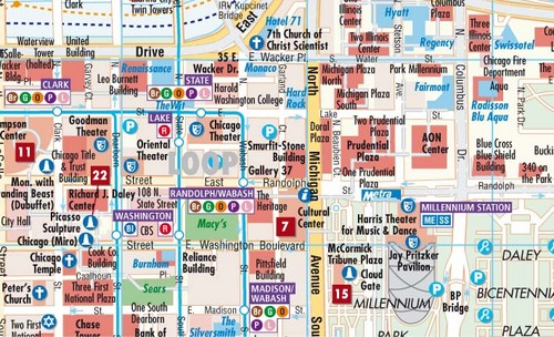 Borch Chicago is een duidelijke, geplastificeerde plattegrond van het centrum met informatie over openbaar vervoer en bezienswaardigheden. Inclusief straatnamenregister.