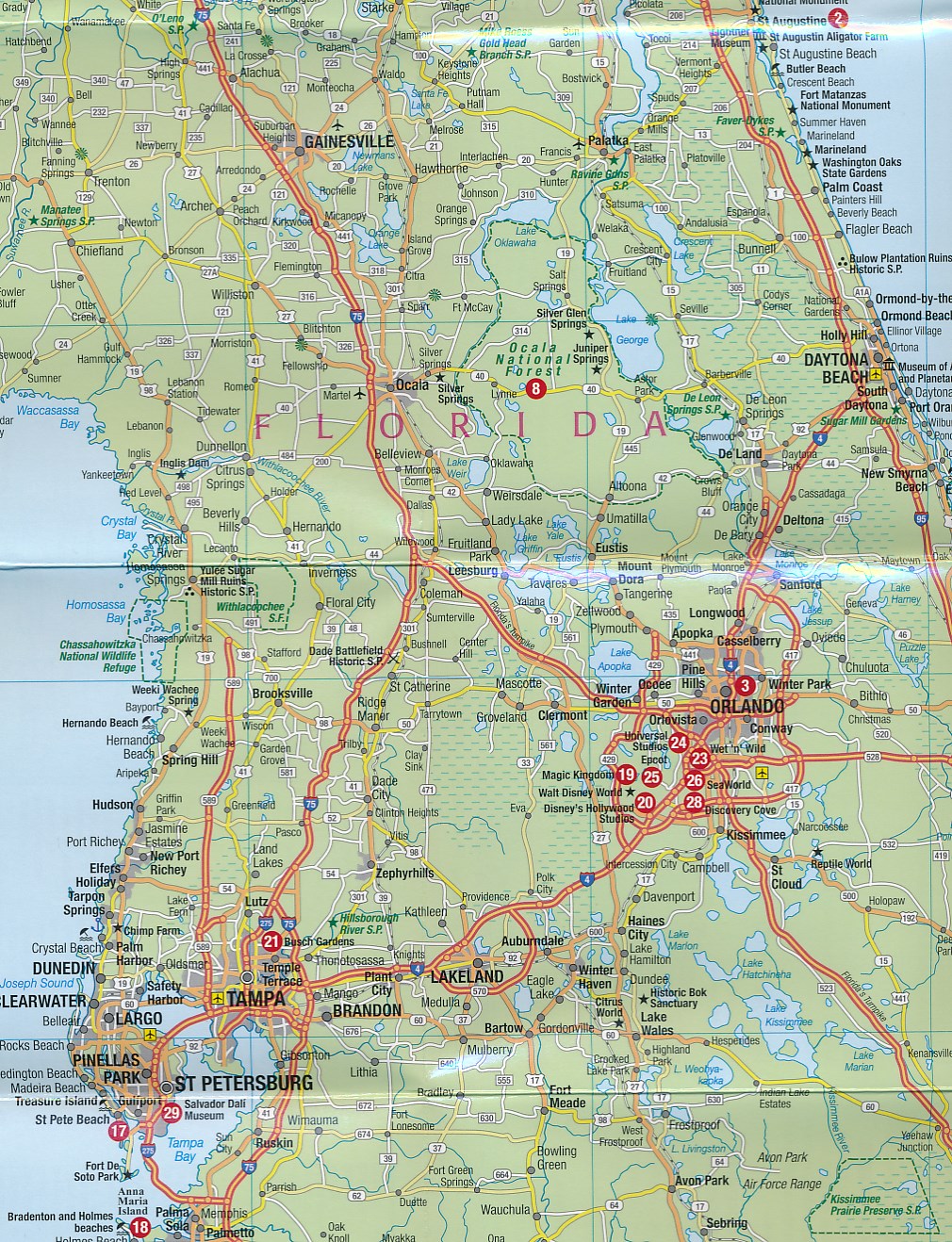Geplastificeerde kaart van Florida, met register. Voor de 'gewone' toerist een handige kaart, geen groot formaat, overzichtelijk met alle belangrijke plaatsen goed weergegeven.