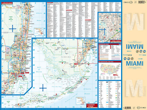 Our soft-laminated folded map of Miami shows: Miami Downtown 1:15 000, Miami Beach 1:15 000, Coconut Grove 1:15 000, Greater Miami 1:350 000, Southern Florida 1:500 000, Coral Gables 1:30 000, Public Transportation Miami, Top 30 Sights, USA administrative & time zones. Borch Maps are easy to fold, durable and water-repellent with a wipeable surface. Borch Maps show hotels, museums, monuments, markets, public transport, top sights and points of interest, useful statistics, conversion charts for temperatures, weights and measurements, climate charts showing temperatures, sunshine hours, precipitation and humidity, overview maps, time zones, and much more...