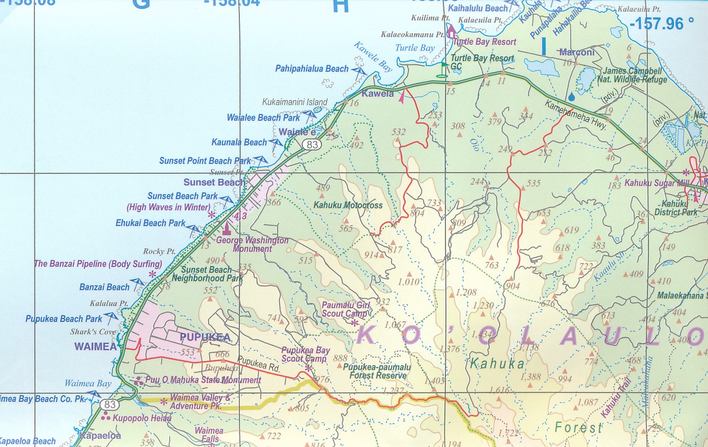 This map represents a major change for ITMB. It is completely new artwork, using the latest satellite downloads, and is GPS compliant. The contouring is superb, the roads easy to read, and the rivers clearly shown. Naturally, all towns and touristic sites have been included and the map is fully indexed. New features for this edition, apart from the artwork itself, is the use of plastic paper and the inclusion of a detailed map of Honolulu from Waikiki to Pearl harbour. All the state's islands have been included, with Big Island and Oahu on one side, and Maui and the other islands on the reverse. This map is a huge improvement.