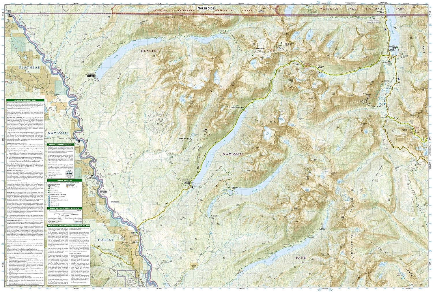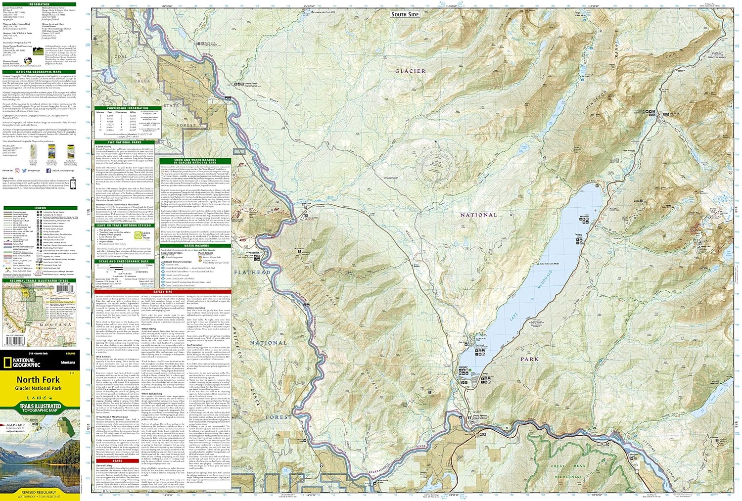 National Geographic's Trails Illustrated map of North Fork in Glacier National Park will benefit even the most experienced outdoors enthusiast, as you explore this pristine landscape that has very few amenities. Two additional maps for Many Glacier and the Two Medicine regions of the park along with a comprehensive Glacier National Park Trails Illustrated map are also available.Created in partnership with the National Park Service, U.S. Forest Service and others, this expertly researched map features key areas of interest such as Bowman Lake, Lake McDonald Valley, Goat Haunt and Avalanche Creek.The North Fork map is an invaluable resource for exploring the mapped trails of the area, including the Pacific Northwest Trail, the Continental Divide Trail and recommended biking trails. The map base includes contour lines and elevations for summits, passes and major lakes. Charts of unbridged stream crossings as well as seasonal plank and suspension bridges will also aid in your navigation of the area. Recreation features are clearly marked, including campgrounds, backcountry campsites, trailheads, interpretive trails, fishing and boat access and horse rental locations. A variety of helpful information about recreation activities available in the park, backcountry hiking and camping, regulations, and safety tips is included as well.