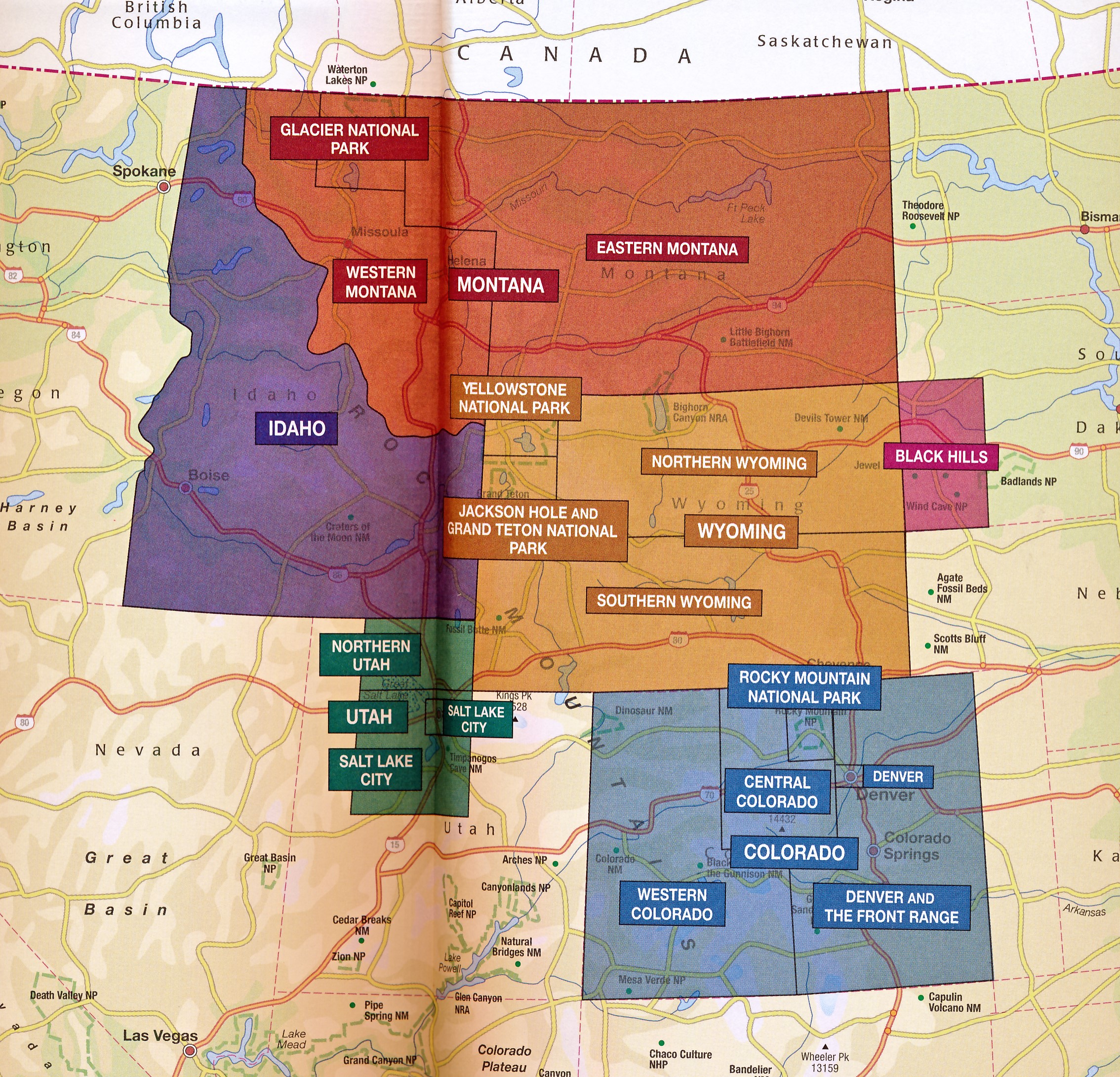 Every part of the USA, from South Carolina to Seattle has its own colour assigned for easy navigation of this USA The Rockies travel guide.