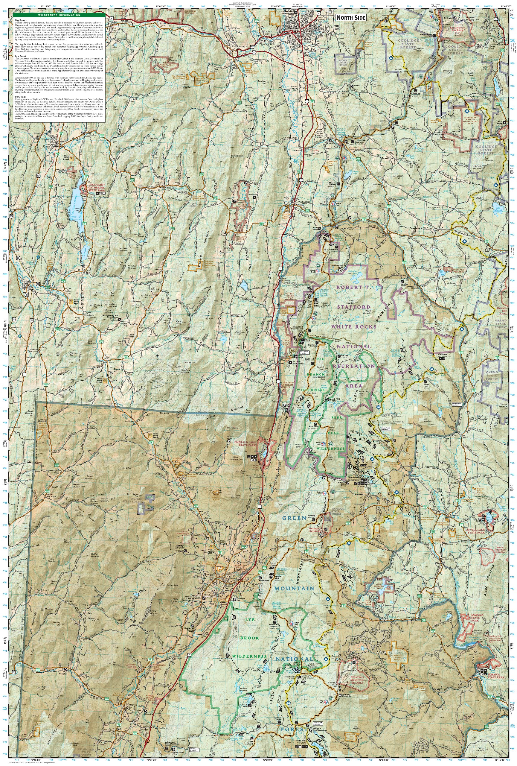 Some of the places shown on the north side of the Green Mountain N.F. map are: Robert T. Stafford White Rocks National Recreation Area, Big Brand Wilderness, Peru Peak Wilderness, Lye Brook Wilderness, Rutland, Killington, Coolidge State Forest, Stratton Mountain, Jamaica State Park, Lake Saint Catherine State Park, and more.