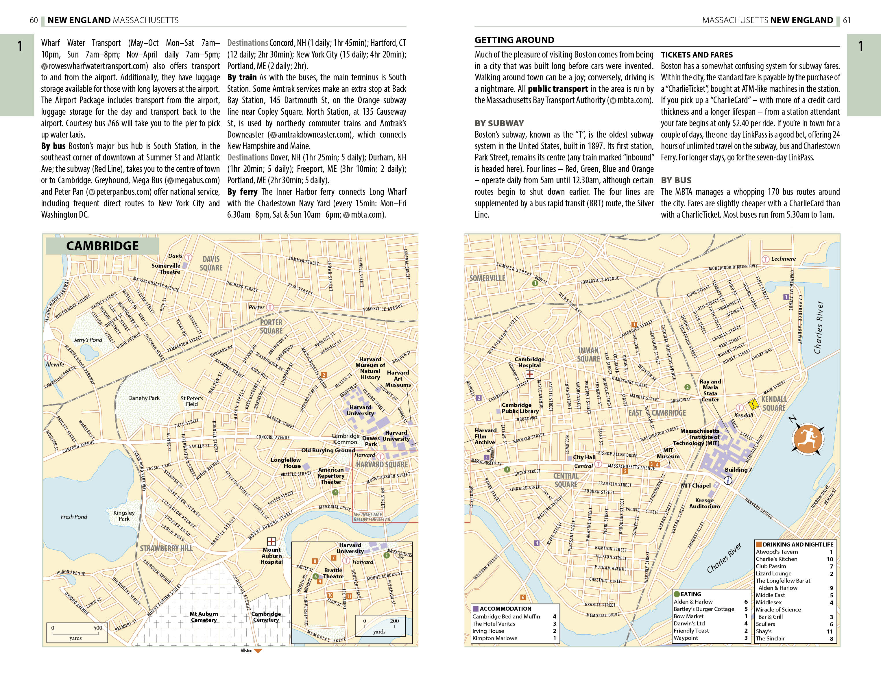 Practical full-colour maps, with clearly numbered, colour-coded keys for quick orientation in Cambridge, Providence and many more locations in New England, reduce need to go online.