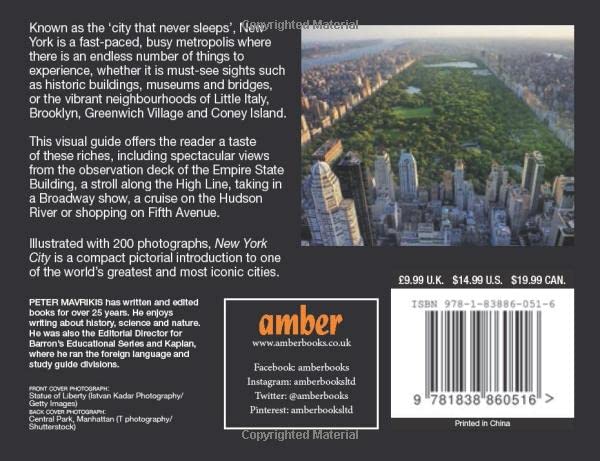 America's most populous city has been described as the cultural, financial, and media capital of the world. It is also a universally recognizable city, home of the Manhattan skyline, Central Park, Brooklyn Bridge, and the headquarters of the United Nations. New York City provides a pictorial exploration of the city's five boroughs: Brooklyn, Queens, Manhattan, the Bronx, and Staten Island. The book introduces the reader to some classic architecture, such as the art deco Chrysler Building and Empire State Building; quirky neighborhoods, such as Greenwich Village, Chinatown, and Hell's Kitchen; iconic landmarks, such as the Statue of Liberty and One World Trade Center; and great cultural centers, such as Broadway, the home of North American theater; Times Square, the "Crossroads of the World"; and Madison Square Garden, an indoor sports and events arena.