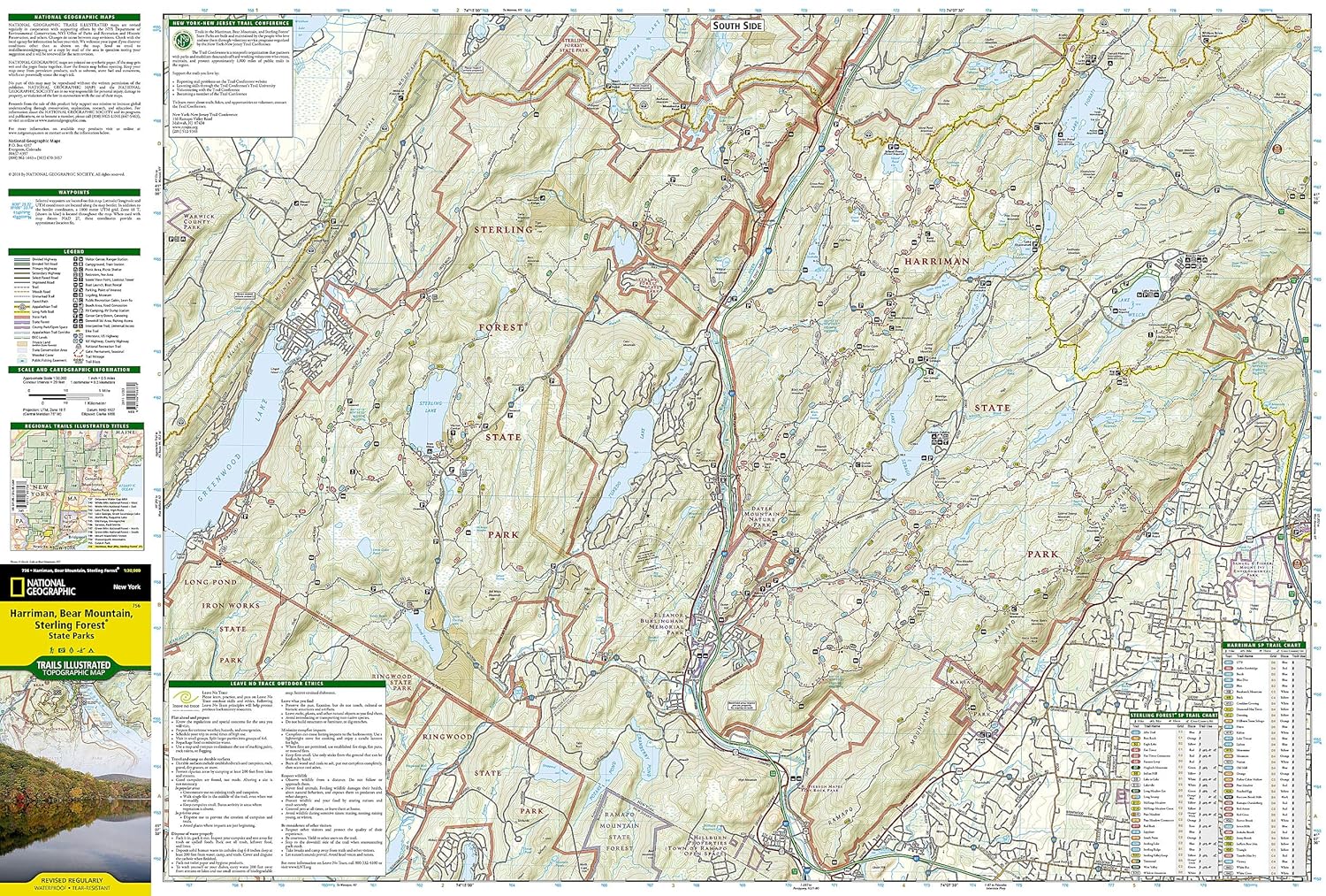 At over 46,000 acres, Harriman State Park is the second largest state park in New York and is located only 30 miles north of New York City. It is a haven for hikers with over 200 miles of trails, and water-sport enthusiasts flock to its three beaches and 31 lakes and reservoirs. On the northeastern edge, the park borders the 5,067-acre Bear Mountain State Park which offers a variety of year-round outdoor activities. Sterling Forest State Park borders Harriman on the southwest. This nearly 22,000-acre forest habitat is important to the survival of many resident and migratory species, including black bear, a variety of hawks and songbirds and many rare invertebrates and plants. National Geographic's Trails Illustrated map of Harriman, Bear Mountain, and Sterling Forest State Parks provides unmatched detail of these parks to meet the needs of casual park visitors and avid adventurers alike. Expertly researched and created in partnership with local land management agencies, this map features key points of interest including Greenwood, Tuxedo, and Sterling lakes; Stony Point Battlefield and Fort Montgomery state historic sites; Hudson River; Haverstraw Bay; High Tor State Park; and Ramapo River.The Appalachian Trail, Long Path Trail, and other national recreational trails wind through the region. Each trail is clearly indicated as is trail mileage, park and forest boundaries, parking areas, and access points. A handy trail chart will help you choose the right path for your use, whether hiking, horseback riding, cross-country skiing, or biking. The map base includes contour lines and elevations for summits, passes and many lakes. Campers will appreciate the inclusion of RV dump stations, group campsites, shelters, restrooms, and more. Activities abound in the region and the location of scenic overlooks, lookout towers, downhill ski areas, boat rentals, fishing access points, and other points of interest make this map as highly functional as it is remarkably crafted.