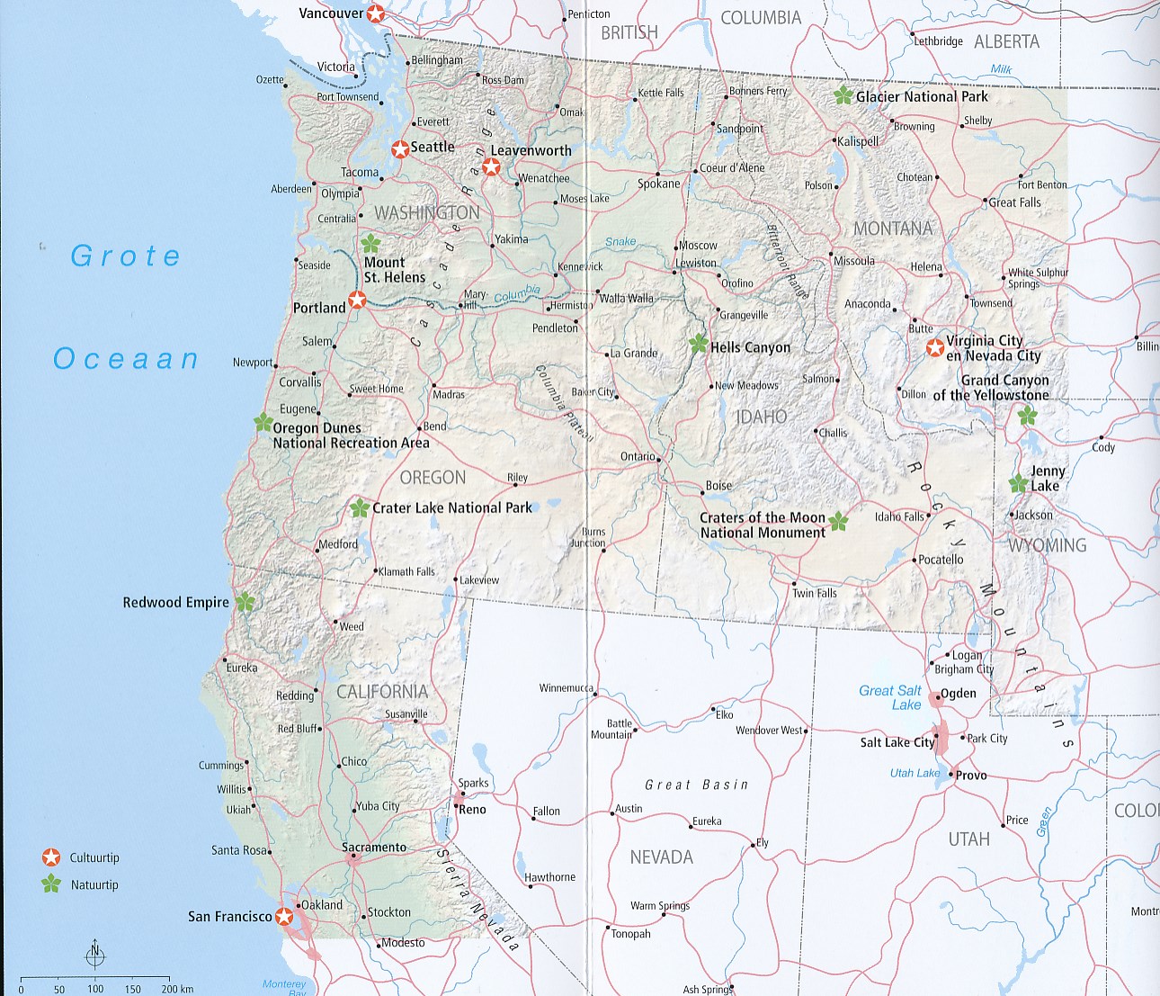 Register: Vancouver, Washington, Oregon, Californië, Montana, Rocky Mountains, Wyoming, Idaho.
