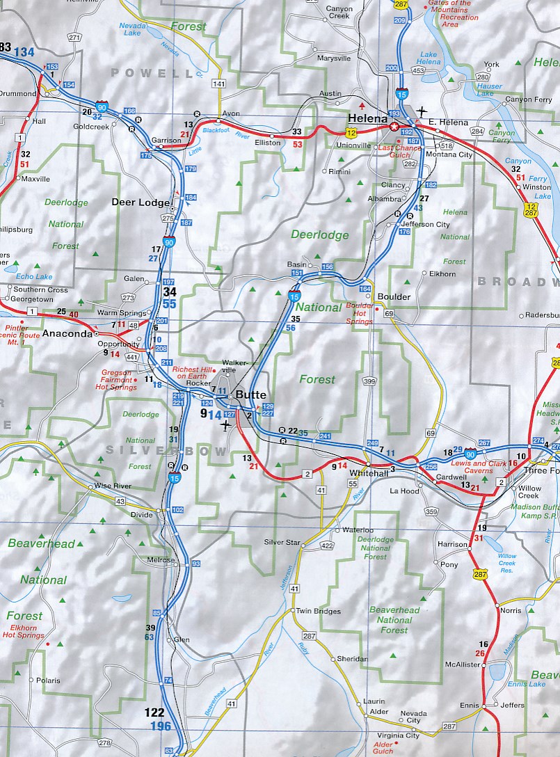 Wegenkaart van Montana, Idaho en Wyoming, aan 2 zijden bedrukt, met register en wegnummers.