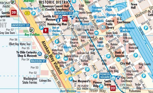 Borch Seattle is een duidelijke, geplastificeerde plattegrond van het centrum met informatie over openbaar vervoer en bezienswaardigheden. Inclusief straatnamenregister.