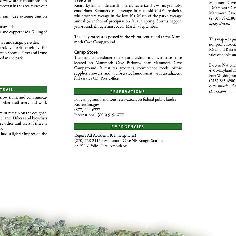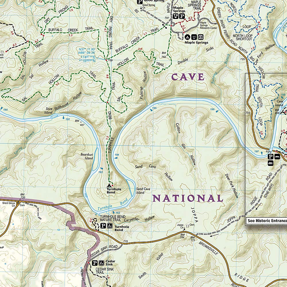 The world's longest known cave system, Mammoth Cave is a fascinating and beautiful labyrinth located below the equally scenic Green River valley and hilly country of south central Kentucky. National Geographic's Trails Illustrated map of Mammoth Cave National Park delivers unmatched detail and valuable information to assist you in your exploration of this unique and compelling region. Expertly researched and created in partnership with local land management agencies, this map features key points of interest including Green and Nolin rivers; First Creek Lake; Houchin Ferry; Turnhole Bend; Dennison Ferry; Maple Springs; and the cities of Brownsville and Park City. The print version of this map includes a detailed inset of the cave area, along with general information about the park and cave, as well as an inset of the historic entrance and vicinity.Designed with a wide range of visitors in mind, this map features detailed topography with contour lines, shaded relief and elevations; easy-to-read trails that are clearly marked according to use; accurate road network; visitor centers and facilities; plus, park regulations, and contact information for local agencies. Trail mileage between intersections will help you choose the path that's right for you. Boaters will appreciate the notation of river mileage, launch sites, and access points. Recreation features are clearly marked, including trailheads, campgrounds, fishing areas, interpretive trails, picnic areas, and rental cabins.