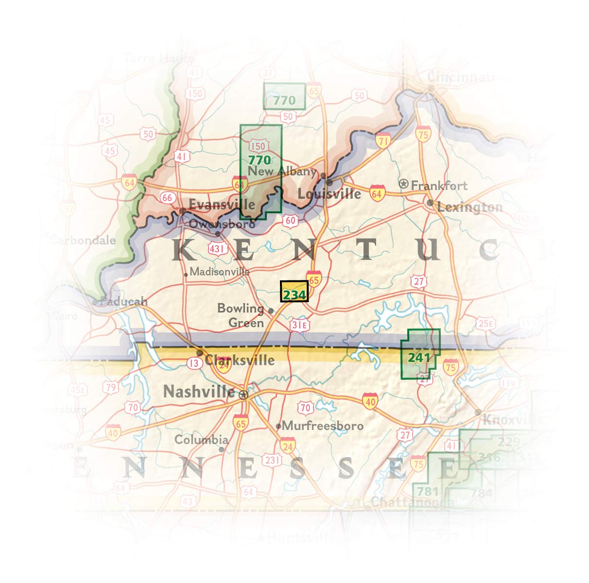 Other features found on this map include: Mammoth Cave National Park, Nolin River, The Knobs.