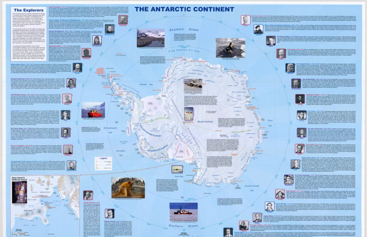 An excellent foldout map of Antarctica. On one side there is a map of the Antarctic continent, around which succinct biographies of Antarctic explorers from William Spiers Bruce to Edward Wilson are shown. On the other side there are many fine colour photographs of seals, penguins and other Antarctic wildlife, together with an inset box summarising the Antarctic Treaty and other information on Antarctic waters, Cape Horn, Tierra del Fuego, the Beagle Channel, the Falkland Islands and South Georgia. Aimed at visitors arriving by sea.