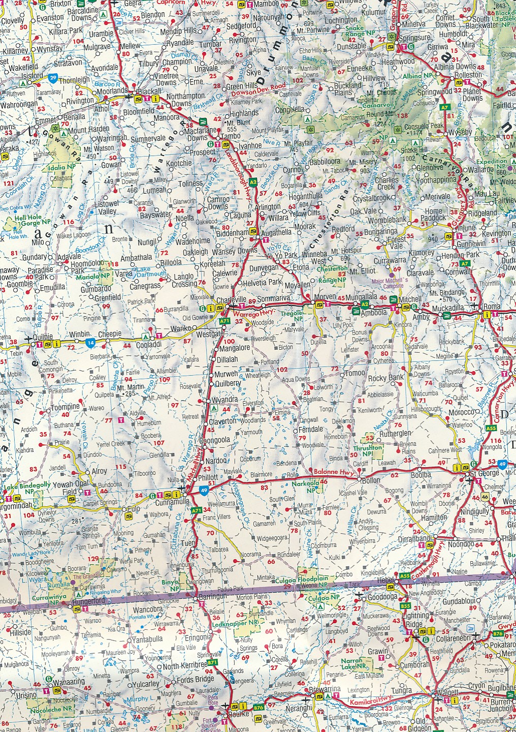 Gedetailleerde landkaart van Australië, prima geschikt voor planning en rondtrekken. De berijdbare wegen zijn goed weergeven, zowel de hoofdwegen als provinciale en lokale wegen; wegnummers worden vermeld. Afstanden tussen plaatsen zijn in kilometers op de kaart ingetekend, daarnaast worden ook op belangrijke plekken benzinepompen gemarkeerd.